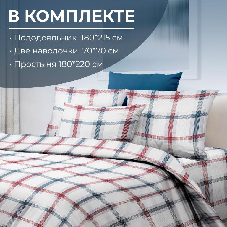 В комплекте: пододеяльник размером 180 * 215 см (прорезь в нижнем шве, длиной 70 см), простыня размером 180 * 220 см, две наволочки размером 70 * 70 см с глубоким клапаном не менее 25 см.