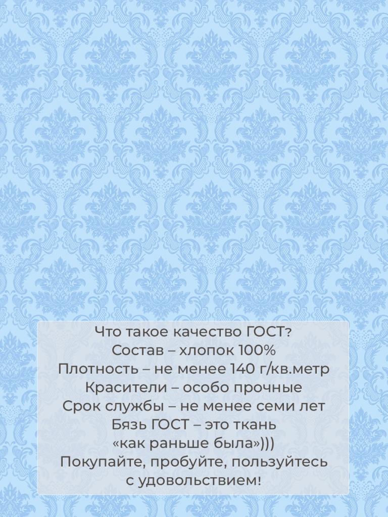 Вам обязательно понравится комплект постельного белья Евростандарт большого размера из бязи ГОСТ, плотностью ткани 140 г/м2! Ткань плотная, лощеная, высочайшего качества. Иногда про неё говорят, что это ткань, «как раньше была». И правильно говорят! Такая ткань имеет длительный срок службы, рисунки на ней смотрятся четко и выразительно. Ну и, конечно, у этой ткани абсолютно натуральный состав - хлопок 100 %, она очень комфортна, экологична, гипоаллергенна, что способствует вашему полноценному отдыху!