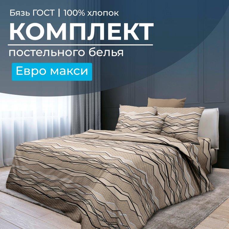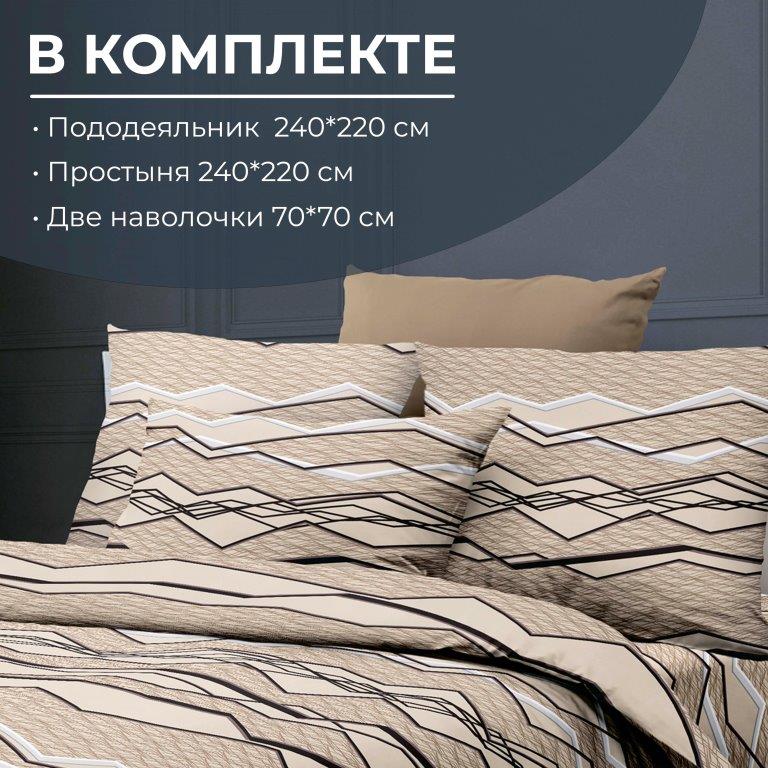 В комплекте: пододеяльник Евромакси размером 240*220 см (вход в пододеяльник выполнен в нижнем шве – прорезь длиной 70 см), простыня размером 240*220 см, две наволочки размером 70*70 см с клапаном не менее 25 см.