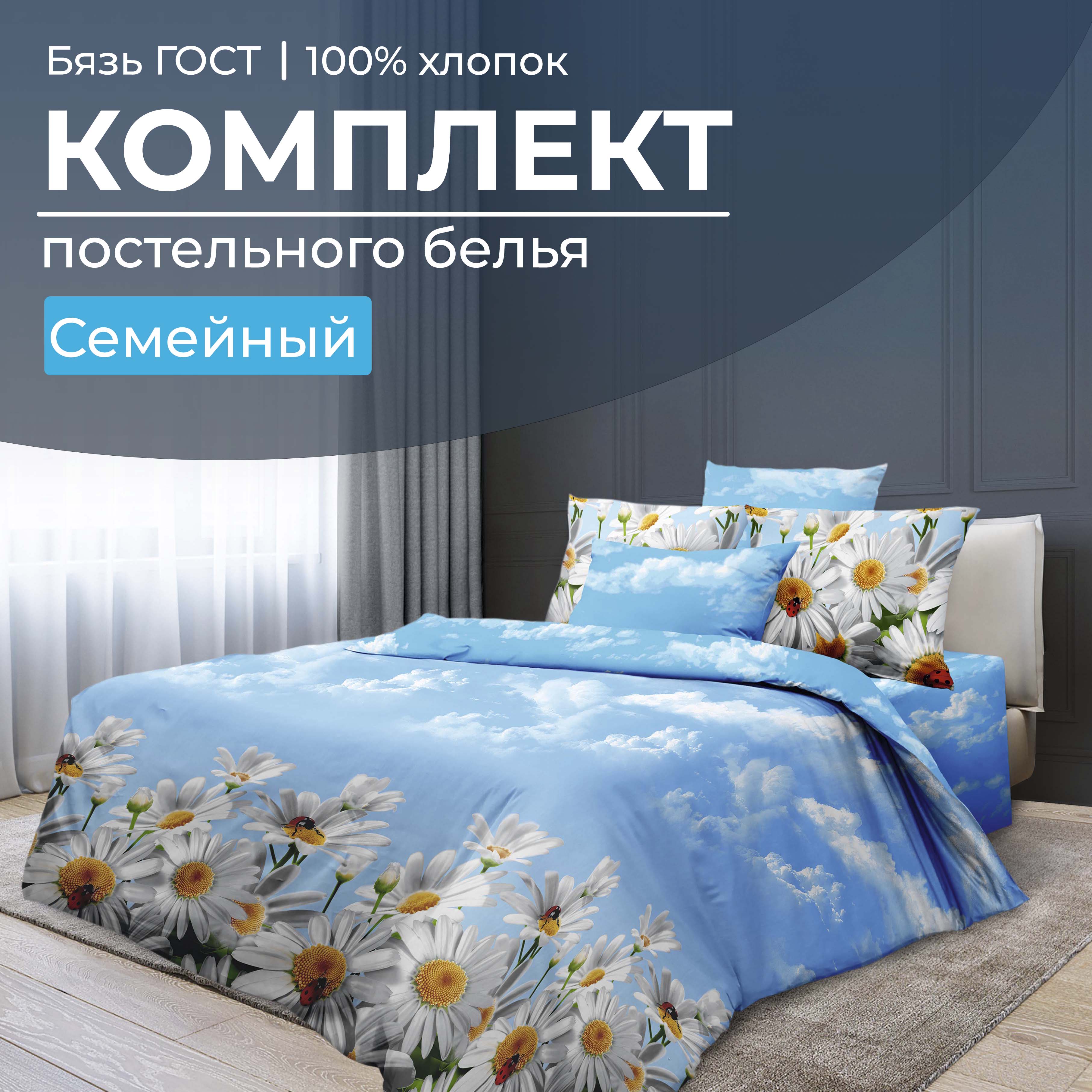Семейный комплект с двумя 1,5-спальными пододеяльниками из бязи ГОСТ, плотностью ткани 140 г/м2. Ткань плотная, лощеная, высочайшего качества. Иногда про неё говорят, что это ткань, «как раньше была». И правильно говорят! Такая ткань имеет длительный срок службы, рисунки на ней смотрятся четко и выразительно. У этой ткани абсолютно натуральный состав - хлопок 100 %, она очень комфортна, экологична, не деформируется, хорошо впитывает влагу, позволяет коже дышать, что способствует вашему полноценному отдыху! В комплекте: два пододеяльника размером 150 * 215 см (вход в пододеяльник выполнен в нижнем шве – прорезь длиной 70 см), простыня размером 240 * 220 см, две наволочки размером 70 * 70 см на клапане глубиной не менее 25 см.