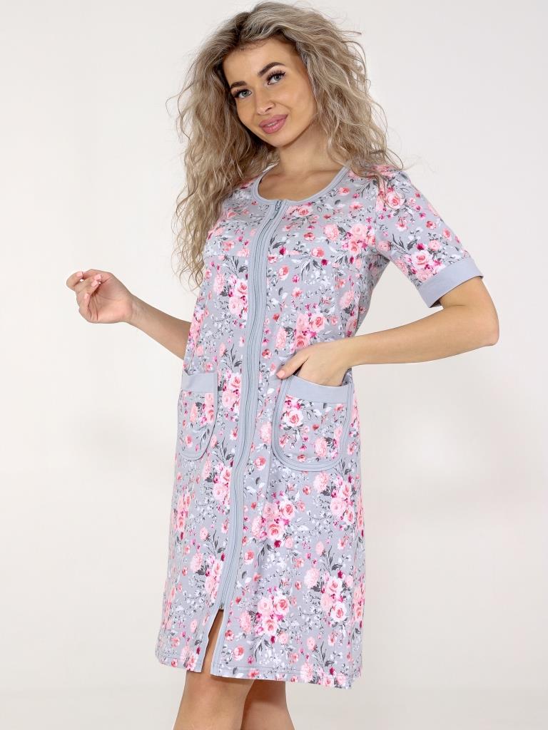 Обратите ваше внимание на женский домашний халат на молнии! С таким халатиком мода дома не умрёт!))) Чудесные расцветки смотрятся свежо и очень нарядно. Изделие имеет широкий размерный ряд: от миниатюрного 44 до больших размеров 54-56. Вы не будете испытывать стеснение и дискомфорт, так как халат изготовлен из хлопковой ткани. Кулирка прекрасно тянется, позволяя Вам свободно двигаться. Длина спинки 98-101 см в зависимости от размера. Полочка длиннее спинки на 5 см. Модель расклешенная, поэтому будет удобна также беременным и кормящим женщинам. Имеются два удобных накладных кармана. Отделка – яркая трикотажная бейка. Очень удобный для выполнения домашней работы короткий рукав. Такая вещь актуальна не только в качестве одежды для дома, она прекрасно смотрится на даче.