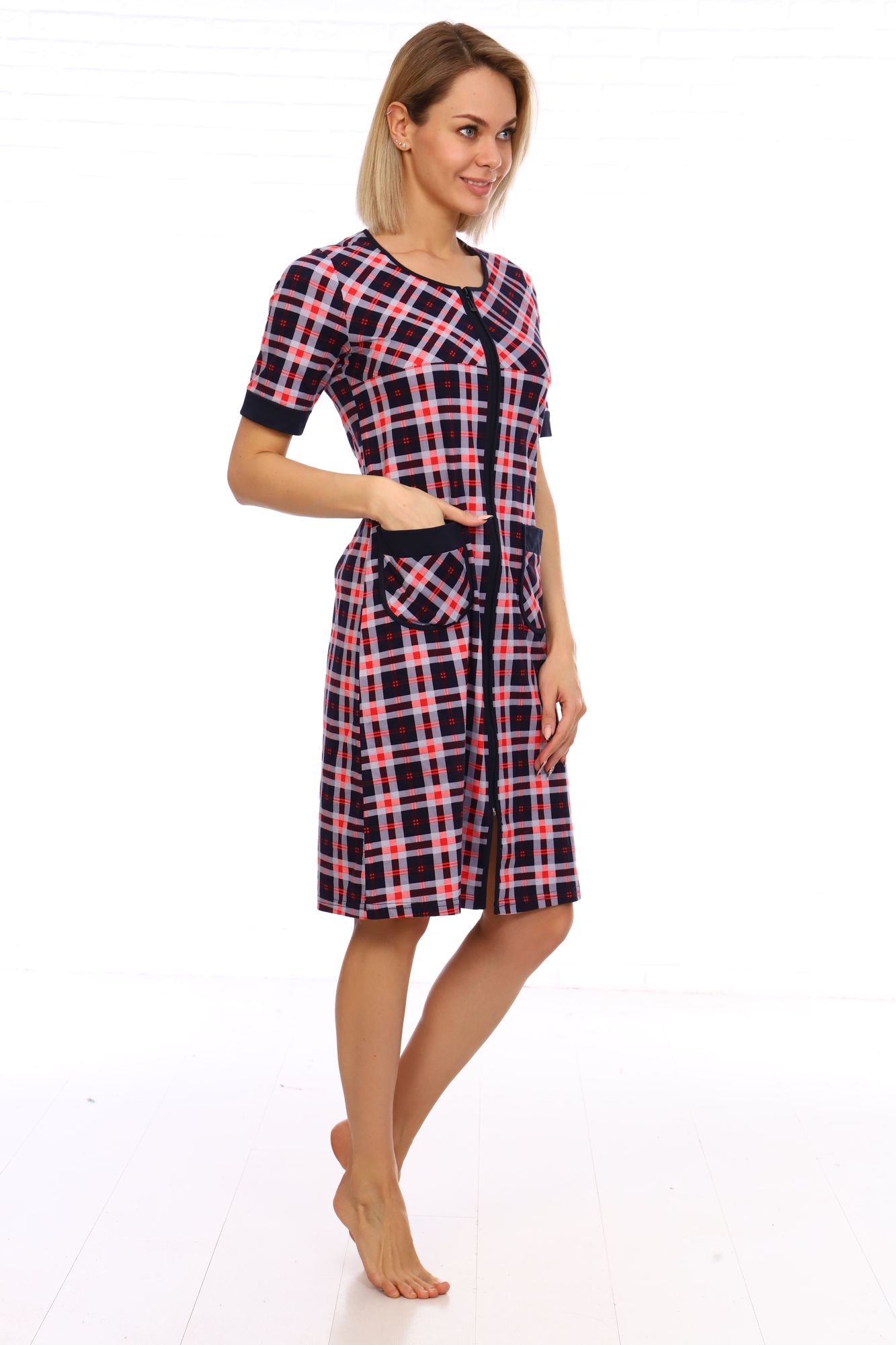 Обратите ваше внимание на женский домашний халат на молнии! С таким халатиком мода дома не умрёт!))) Чудесные расцветки смотрятся свежо и очень нарядно. Изделие имеет широкий размерный ряд: от миниатюрного 44 до больших размеров 54-56. Вы не будете испытывать стеснение и дискомфорт, так как халат изготовлен из хлопковой ткани. Кулирка прекрасно тянется, позволяя Вам свободно двигаться. Длина спинки 98-101 см в зависимости от размера. Полочка длиннее спинки на 5 см. Модель расклешенная, поэтому будет удобна также беременным и кормящим женщинам. Имеются два удобных накладных кармана. Отделка – яркая трикотажная бейка. Очень удобный для выполнения домашней работы короткий рукав. Такая вещь актуальна не только в качестве одежды для дома, она прекрасно смотрится на даче.