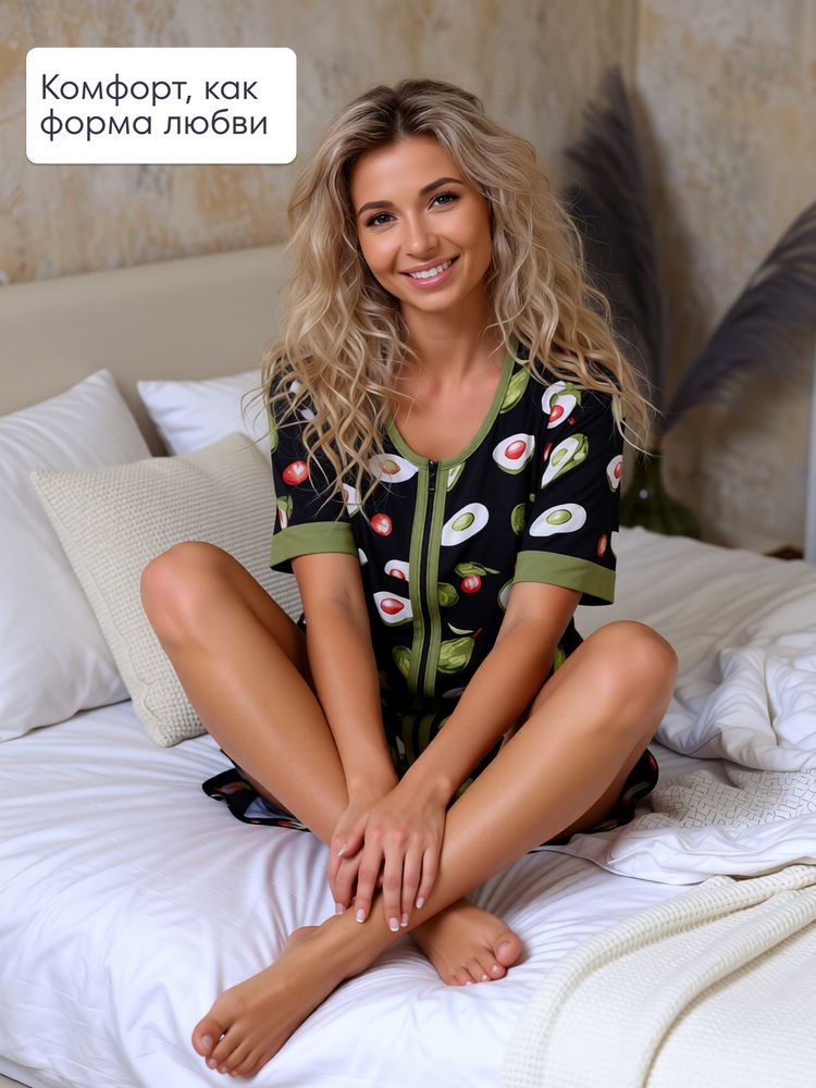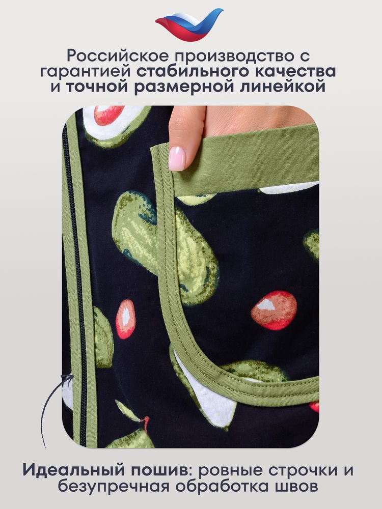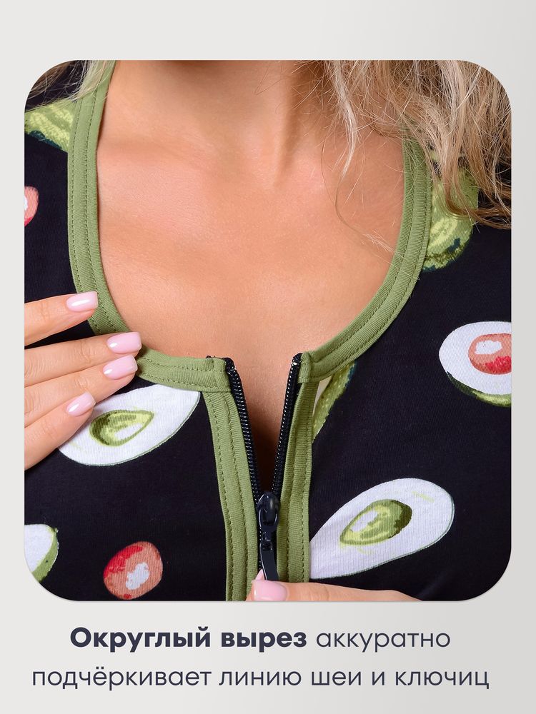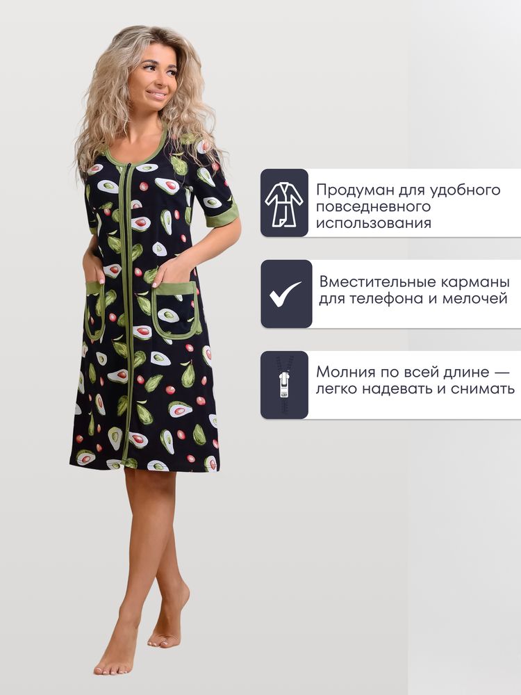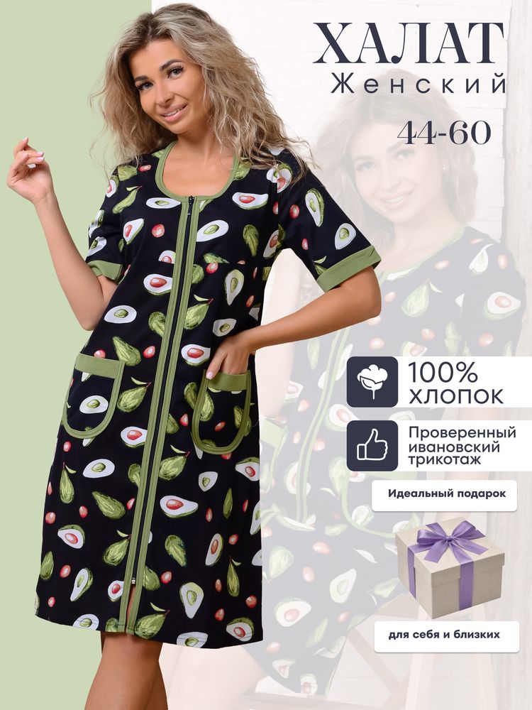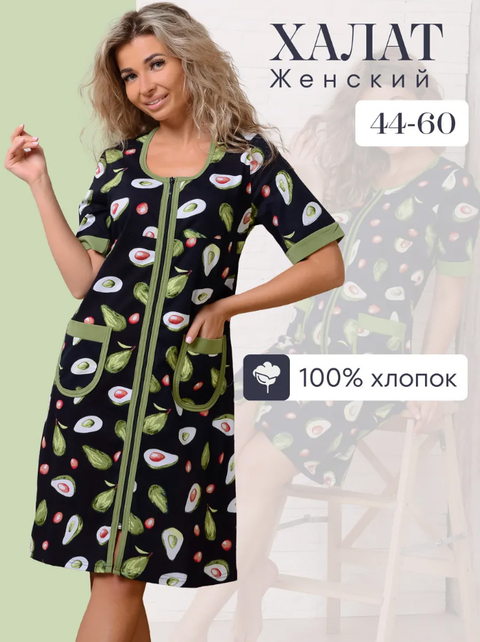 Обратите ваше внимание на женский домашний халат на молнии! С таким халатиком мода дома не умрёт!))) Чудесные расцветки смотрятся свежо и очень нарядно. Изделие имеет широкий размерный ряд: от миниатюрного 44 до больших размеров 54-56. Вы не будете испытывать стеснение и дискомфорт, так как халат изготовлен из хлопковой ткани. Кулирка прекрасно тянется, позволяя Вам свободно двигаться. Длина спинки 98-101 см в зависимости от размера. Полочка длиннее спинки на 5 см. Модель расклешенная, поэтому будет удобна также беременным и кормящим женщинам. Имеются два удобных накладных кармана. Отделка – яркая трикотажная бейка. Очень удобный для выполнения домашней работы короткий рукав. Такая вещь актуальна не только в качестве одежды для дома, она прекрасно смотрится на даче.