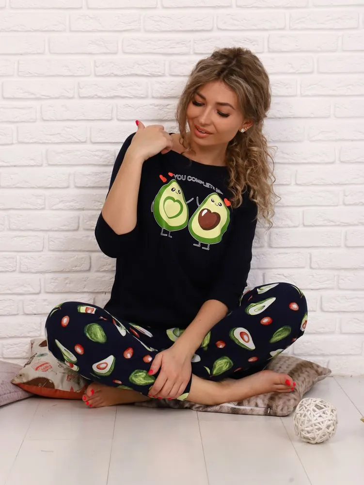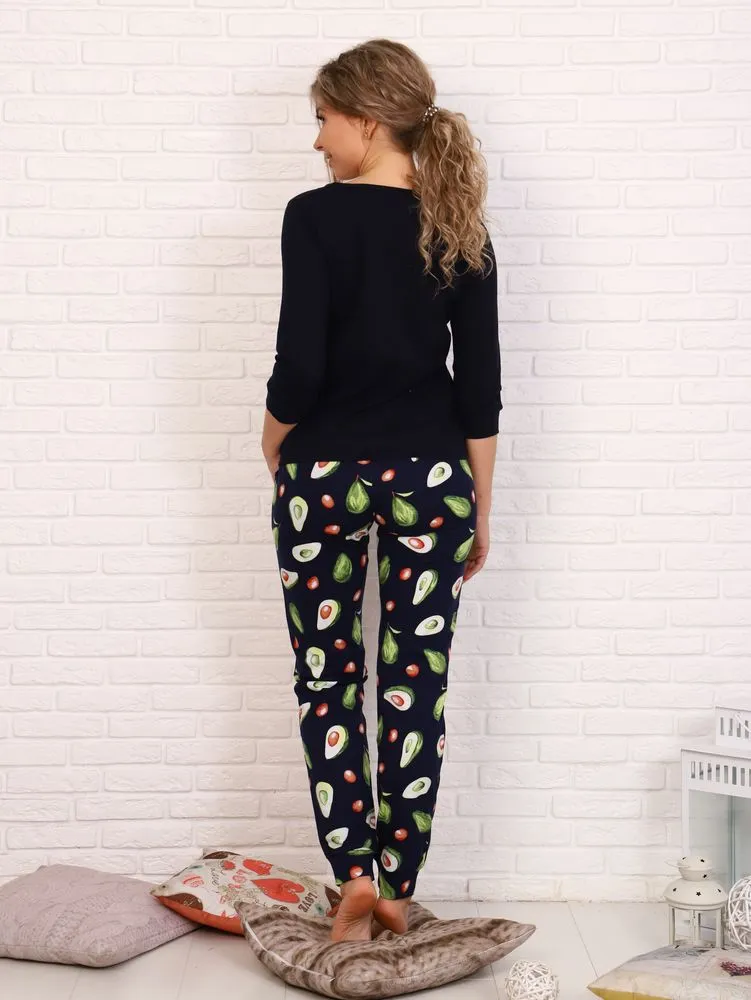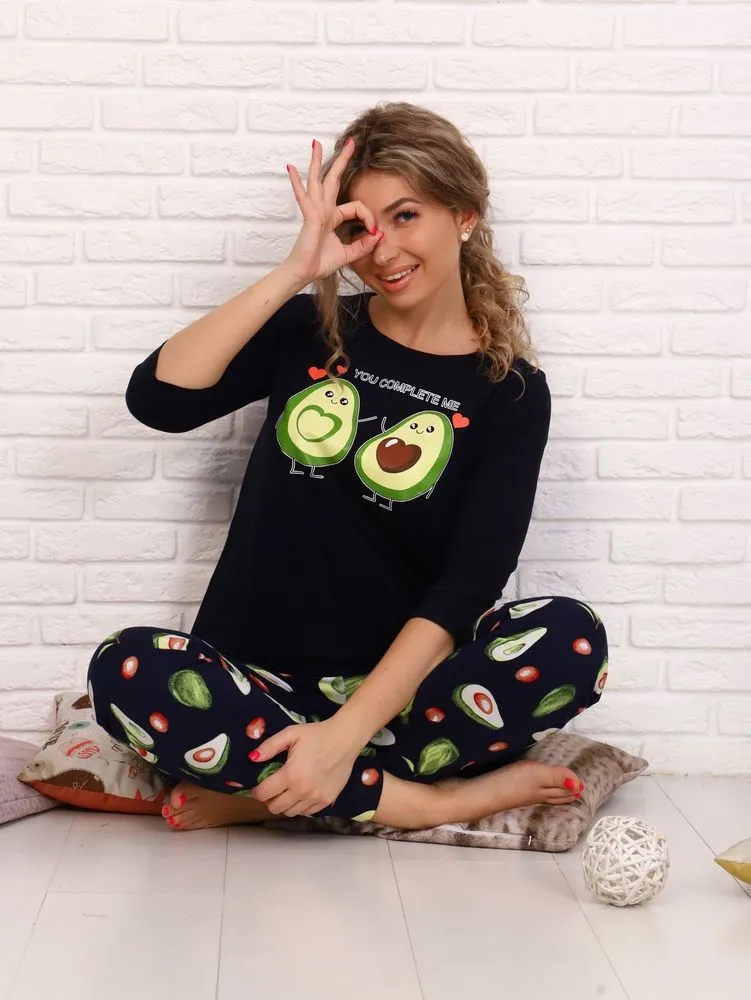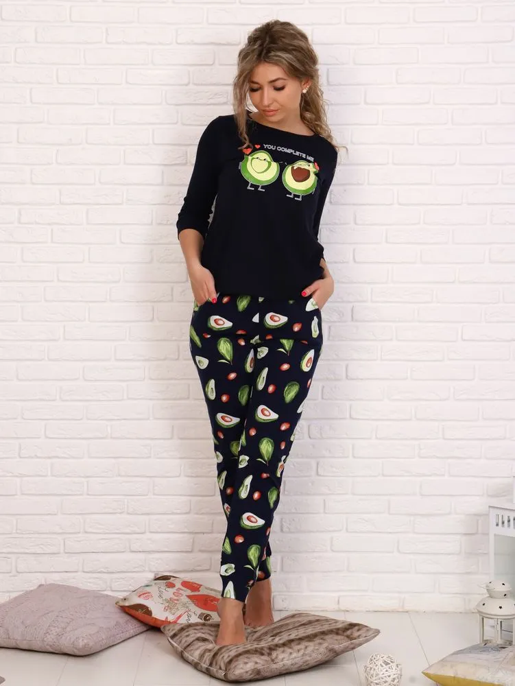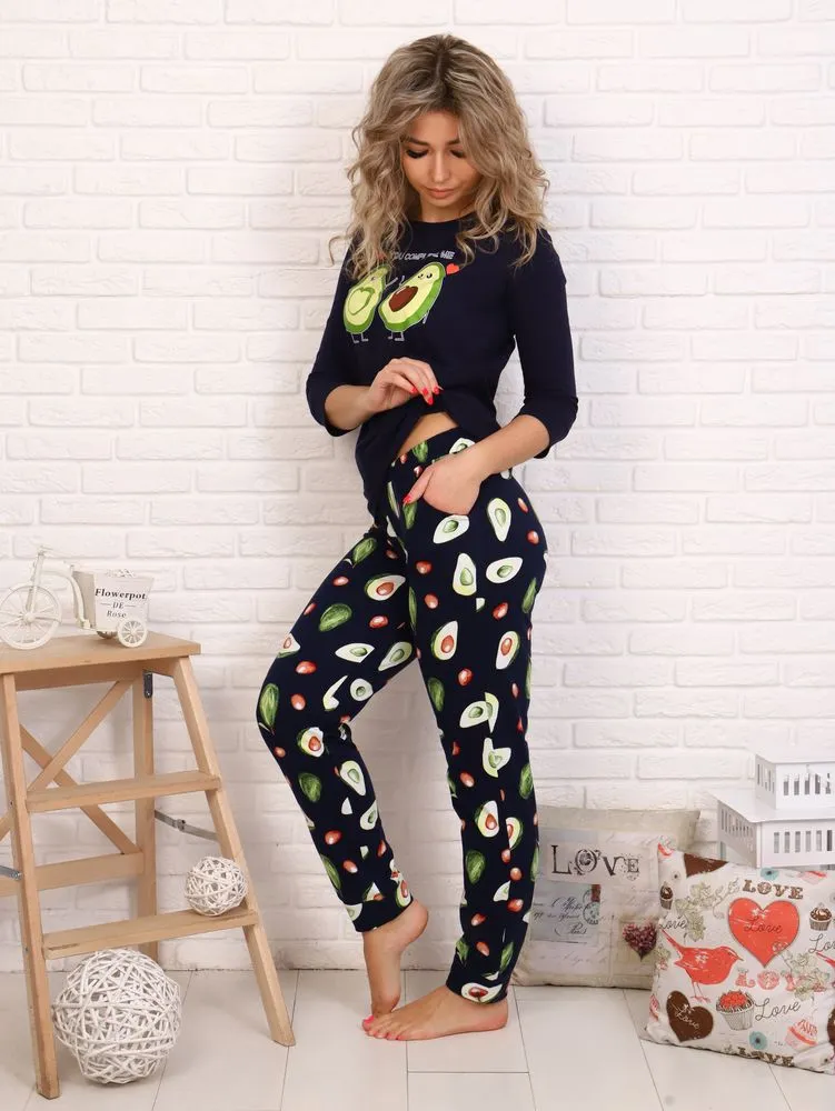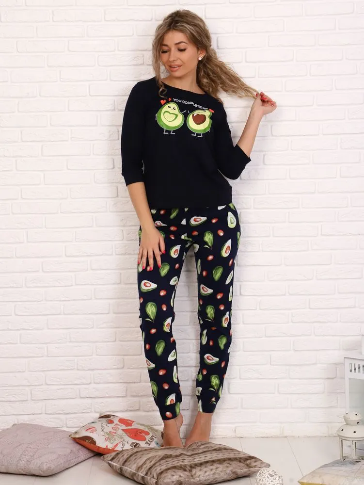 Пижама женская с веселым принтом. Рисунок не только милый, но и качественный, выполнен с использованием современных технологий. Кофта-лонгслив с рукавом 3/4 полуприлегающего кроя. Длинные пижамные брюки-джоггеры с поясом на удобной резинке, с двумя удобными карманами. Резинка закреплена на поясной машине, не переворачивается при стирке. Тип посадки брюк – средняя. Рост универсальный, так как брюки на манжетах. Длина брюк по внутреннему шву 79 см. Ткань – трикотажная кулирная гладь из хлопка, мягкая, лёгкая, очень комфортная. Она не скатывается, сохраняет форму и цвет после множества стирок. Размерная сетка 42-56. Для создания эффекта оверсайз рекомендуем брать на один-два размера больше. Пижама отличный подарок для всех девушек и женщин: маме, подруге, бабушке, сестре, коллеге на любой праздник!