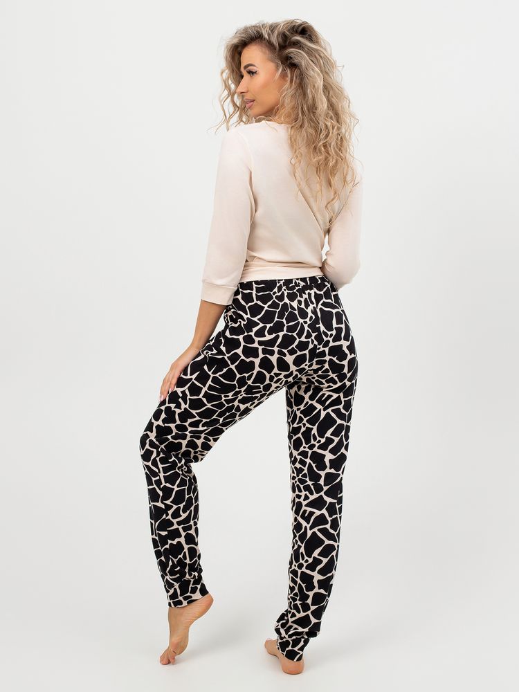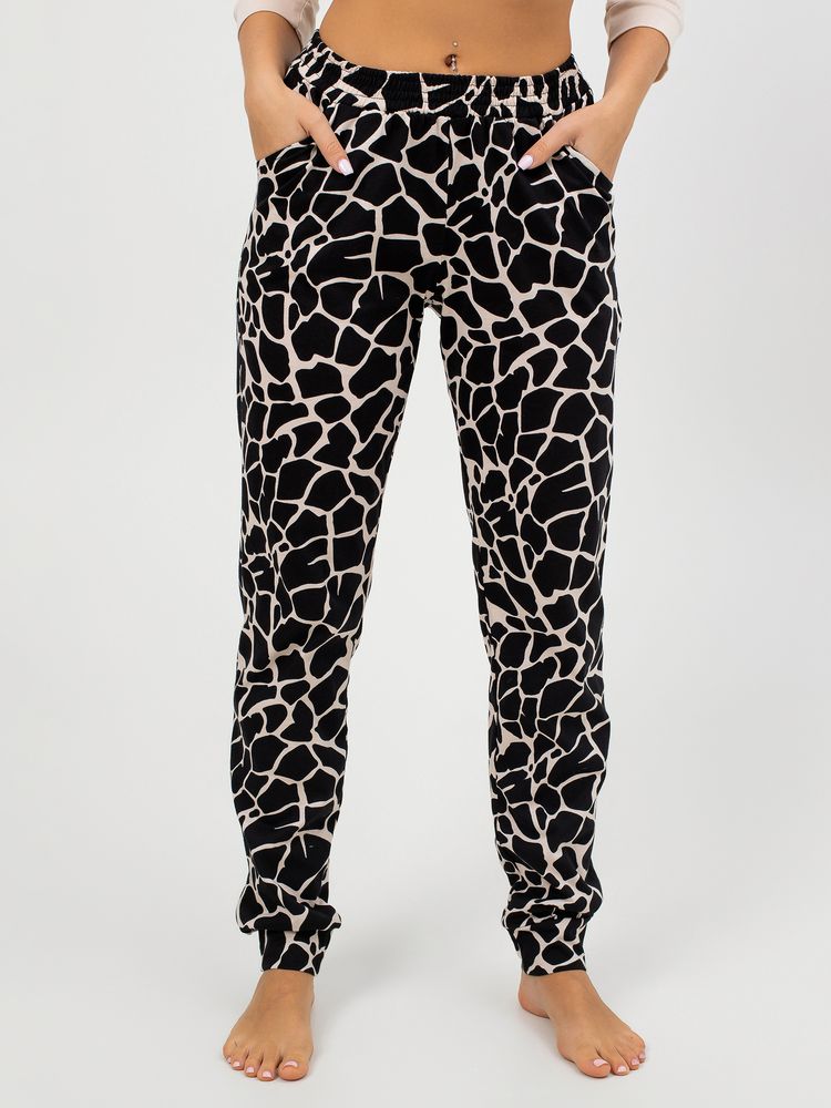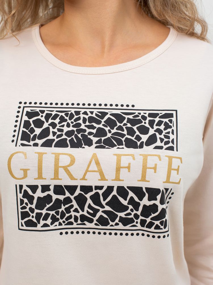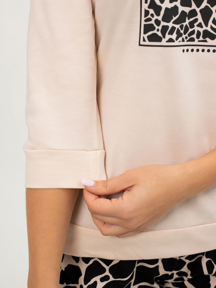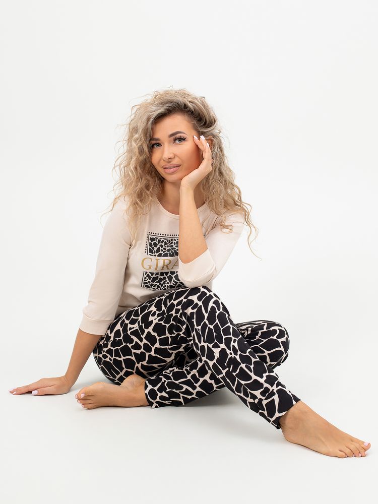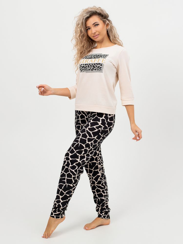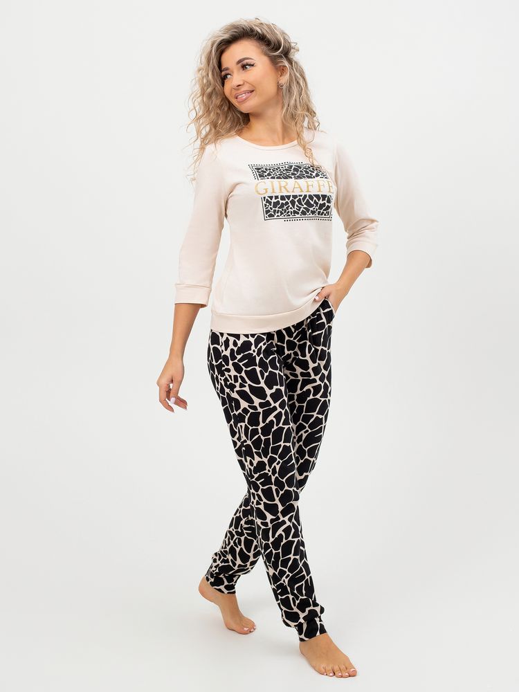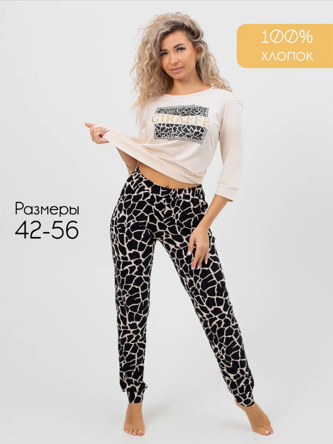 Домашний женский костюм с веселым принтом. Рисунок не только милый, но и качественный, выполнен с использованием современных технологий. Кофта-лонгслив с рукавом 3/4 полуприлегающего кроя. Длинные пижамные брюки-джоггеры с поясом на удобной резинке, с двумя удобными карманами. Резинка закреплена на поясной машине, не переворачивается при стирке. Тип посадки брюк – средняя. Рост универсальный, так как брюки на манжетах. Длина брюк по внутреннему шву 79 см. Ткань – трикотажная кулирная гладь из хлопка, мягкая, лёгкая, очень комфортная. Она не скатывается, сохраняет форму и цвет после множества стирок. Размерная сетка 42-56. Для создания эффекта оверсайз рекомендуем брать на один-два размера больше. Пижама отличный подарок для всех девушек и женщин: маме, подруге, бабушке, сестре, коллеге на любой праздник!