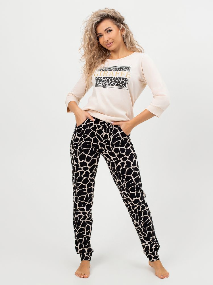 Домашний женский костюм с веселым принтом. Рисунок не только милый, но и качественный, выполнен с использованием современных технологий. Кофта-лонгслив с рукавом 3/4 полуприлегающего кроя. Длинные пижамные брюки-джоггеры с поясом на удобной резинке, с двумя удобными карманами. Резинка закреплена на поясной машине, не переворачивается при стирке. Тип посадки брюк – средняя. Рост универсальный, так как брюки на манжетах. Длина брюк по внутреннему шву 79 см. Ткань – трикотажная кулирная гладь из хлопка, мягкая, лёгкая, очень комфортная. Она не скатывается, сохраняет форму и цвет после множества стирок. Размерная сетка 42-56. Для создания эффекта оверсайз рекомендуем брать на один-два размера больше. Пижама отличный подарок для всех девушек и женщин: маме, подруге, бабушке, сестре, коллеге на любой праздник!