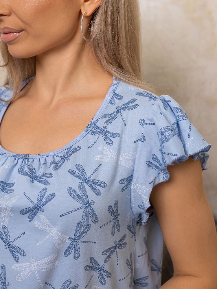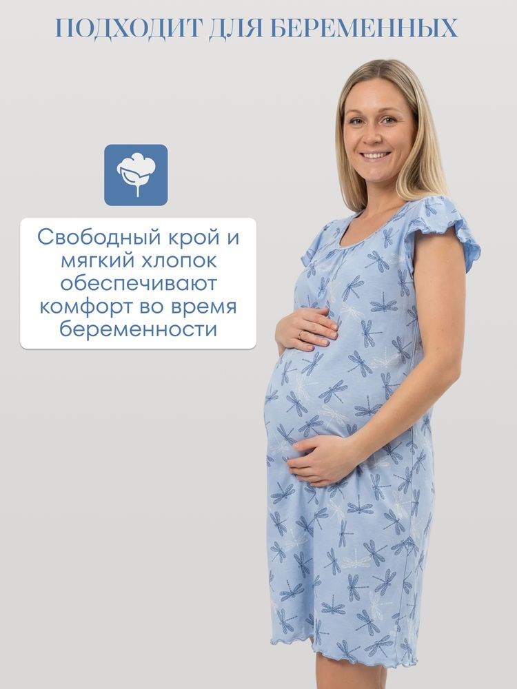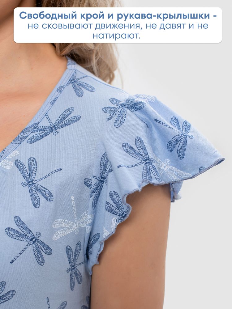Перед Вами милая и нежная женская сорочка для комфортного сна. Лёгкая ночнушка свободного кроя прекрасно сидит на фигуре любого типа. Изготовлена из 100% натурального хлопка, ткань мягкая, дышащая и приятная к телу, прекрасно тянется.  В то же время ткань достаточно плотная, не просвечивает. Очень мило смотрятся нежные веточки лаванды, мелкие изящные цветочки, кружевные сердечки на светлом фоне. Рукав –крылышко со сборками дает полную свободу движений. Отделка рукава и низа изделия (обметочная строчка с вытяжкой ткани) смотрится легко, воздушно. Небольшое изящное украшение из атласной ленточки на овальном вырезе горловины завершает нежный образ. Длина изделия – чуть ниже колена. Рост сорочки универсальный. Силуэт сорочки расклешенный, она прекрасно подойдёт также будущим мамам. Размерный ряд 44-60.