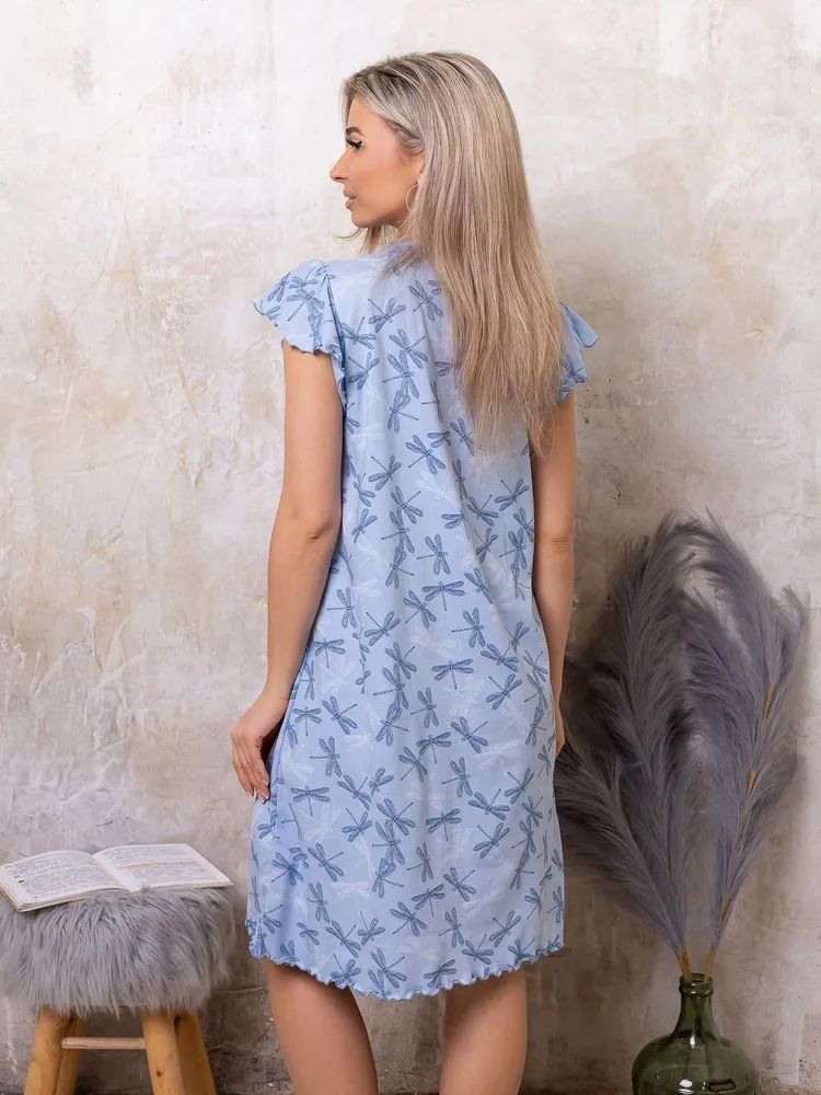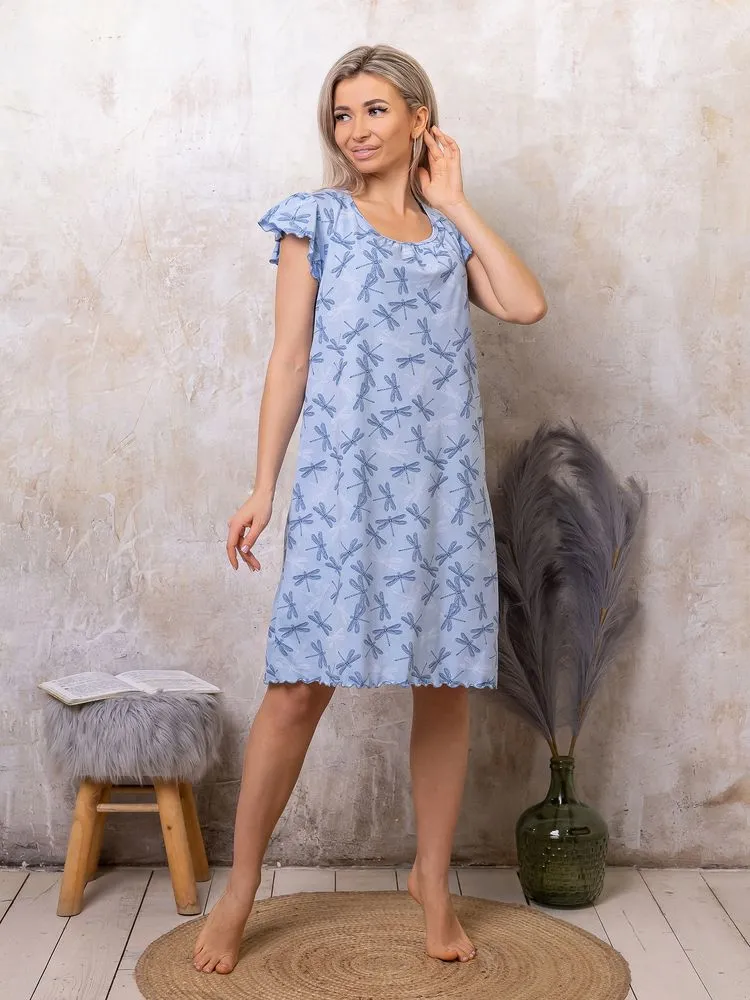 Перед Вами милая и нежная женская сорочка для комфортного сна. Лёгкая ночнушка свободного кроя прекрасно сидит на фигуре любого типа. Изготовлена из 100% натурального хлопка, ткань мягкая, дышащая и приятная к телу, прекрасно тянется.  В то же время ткань достаточно плотная, не просвечивает. Очень мило смотрятся нежные веточки лаванды, мелкие изящные цветочки, кружевные сердечки на светлом фоне. Рукав –крылышко со сборками дает полную свободу движений. Отделка рукава и низа изделия (обметочная строчка с вытяжкой ткани) смотрится легко, воздушно. Небольшое изящное украшение из атласной ленточки на овальном вырезе горловины завершает нежный образ. Длина изделия – чуть ниже колена. Рост сорочки универсальный. Силуэт сорочки расклешенный, она прекрасно подойдёт также будущим мамам. Размерный ряд 44-60.