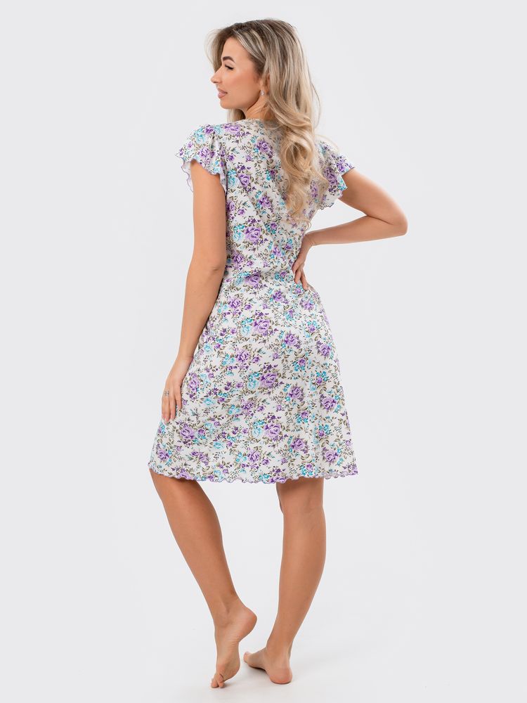 Перед Вами милая и нежная женская сорочка для комфортного сна. Лёгкая ночнушка свободного кроя прекрасно сидит на фигуре любого типа. Изготовлена из 100% натурального хлопка, ткань мягкая, дышащая и приятная к телу, прекрасно тянется.  В то же время ткань достаточно плотная, не просвечивает. Очень мило смотрятся нежные веточки лаванды, мелкие изящные цветочки, кружевные сердечки на светлом фоне. Рукав –крылышко со сборками дает полную свободу движений. Отделка рукава и низа изделия (обметочная строчка с вытяжкой ткани) смотрится легко, воздушно. Небольшое изящное украшение из атласной ленточки на овальном вырезе горловины завершает нежный образ. Длина изделия – чуть ниже колена. Рост сорочки универсальный. Силуэт сорочки расклешенный, она прекрасно подойдёт также будущим мамам. Размерный ряд 44-60.