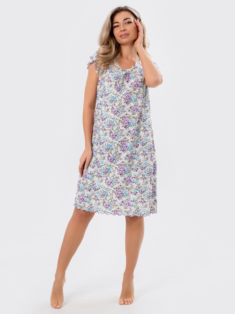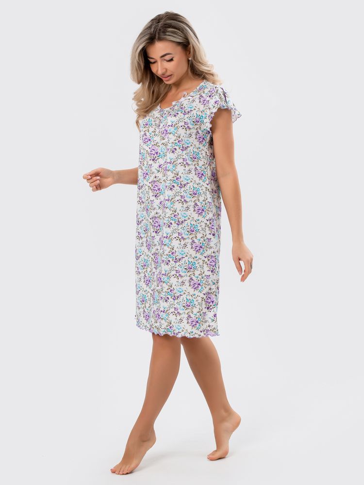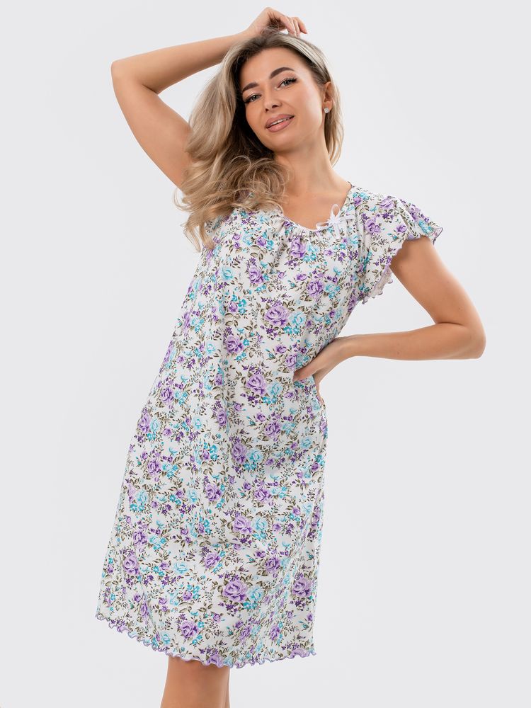 Перед Вами милая и нежная женская сорочка для комфортного сна. Лёгкая ночнушка свободного кроя прекрасно сидит на фигуре любого типа. Изготовлена из 100% натурального хлопка, ткань мягкая, дышащая и приятная к телу, прекрасно тянется.  В то же время ткань достаточно плотная, не просвечивает. Очень мило смотрятся нежные веточки лаванды, мелкие изящные цветочки, кружевные сердечки на светлом фоне. Рукав –крылышко со сборками дает полную свободу движений. Отделка рукава и низа изделия (обметочная строчка с вытяжкой ткани) смотрится легко, воздушно. Небольшое изящное украшение из атласной ленточки на овальном вырезе горловины завершает нежный образ. Длина изделия – чуть ниже колена. Рост сорочки универсальный. Силуэт сорочки расклешенный, она прекрасно подойдёт также будущим мамам. Размерный ряд 44-60.