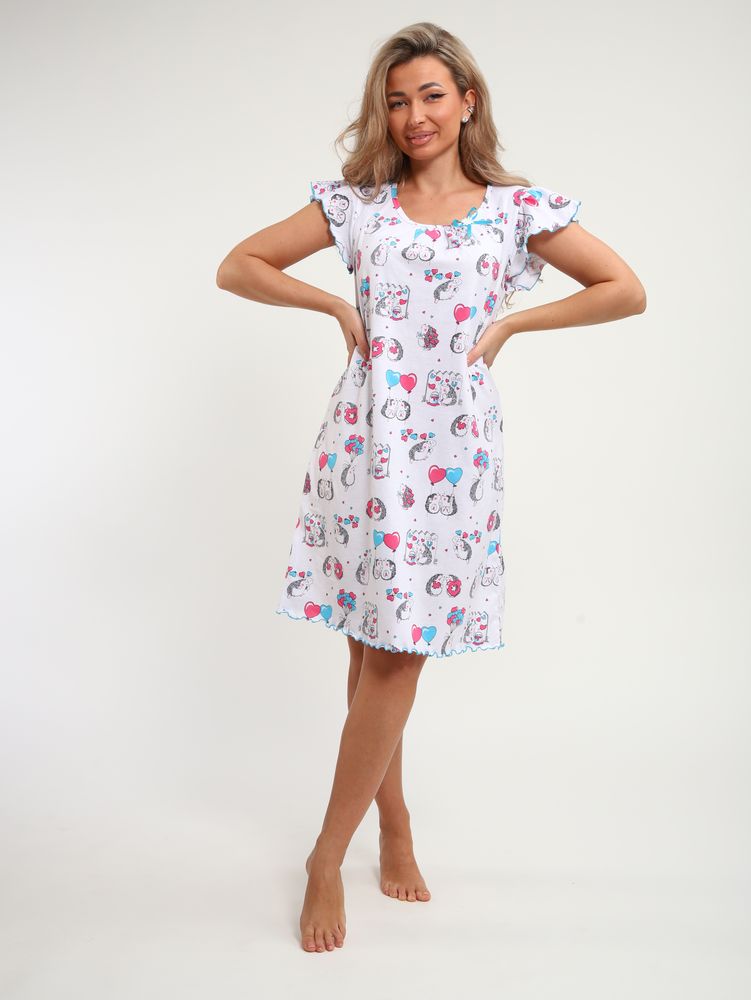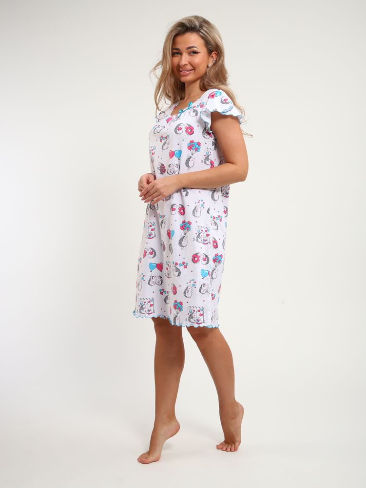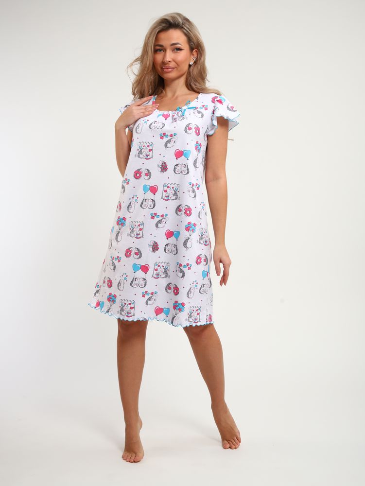 Перед Вами милая и нежная женская сорочка для комфортного сна. Лёгкая ночнушка свободного кроя прекрасно сидит на фигуре любого типа. Изготовлена из 100% натурального хлопка, ткань мягкая, дышащая и приятная к телу, прекрасно тянется.  В то же время ткань достаточно плотная, не просвечивает. Очень мило смотрятся нежные веточки лаванды, мелкие изящные цветочки, кружевные сердечки на светлом фоне. Рукав –крылышко со сборками дает полную свободу движений. Отделка рукава и низа изделия (обметочная строчка с вытяжкой ткани) смотрится легко, воздушно. Небольшое изящное украшение из атласной ленточки на овальном вырезе горловины завершает нежный образ. Длина изделия – чуть ниже колена. Рост сорочки универсальный. Силуэт сорочки расклешенный, она прекрасно подойдёт также будущим мамам. Размерный ряд 44-60.