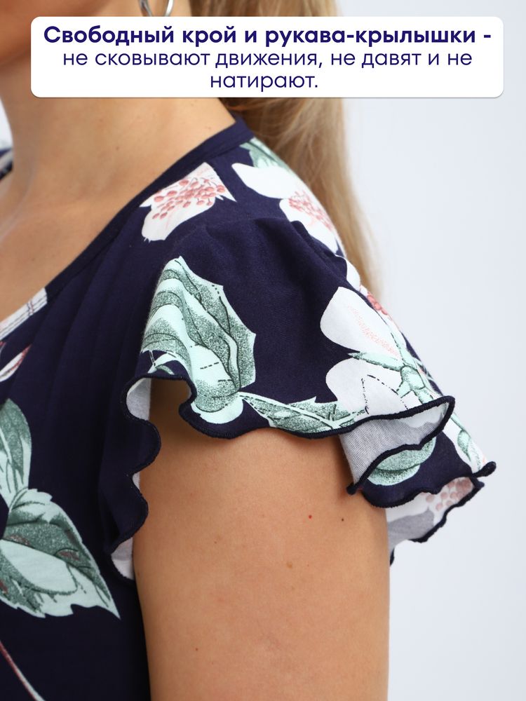 Перед Вами милая и нежная женская сорочка для комфортного сна. Лёгкая ночнушка свободного кроя прекрасно сидит на фигуре любого типа. Изготовлена из 100% натурального хлопка, ткань мягкая, дышащая и приятная к телу, прекрасно тянется.  В то же время ткань достаточно плотная, не просвечивает. Очень мило смотрятся нежные веточки лаванды, мелкие изящные цветочки, кружевные сердечки на светлом фоне. Рукав –крылышко со сборками дает полную свободу движений. Отделка рукава и низа изделия (обметочная строчка с вытяжкой ткани) смотрится легко, воздушно. Небольшое изящное украшение из атласной ленточки на овальном вырезе горловины завершает нежный образ. Длина изделия – чуть ниже колена. Рост сорочки универсальный. Силуэт сорочки расклешенный, она прекрасно подойдёт также будущим мамам. Размерный ряд 44-60.