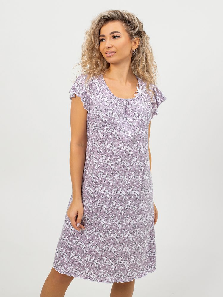 Перед Вами милая и нежная женская сорочка для комфортного сна. Лёгкая ночнушка свободного кроя прекрасно сидит на фигуре любого типа. Изготовлена из 100% натурального хлопка, ткань мягкая, дышащая и приятная к телу, прекрасно тянется.  В то же время ткань достаточно плотная, не просвечивает. Очень мило смотрятся нежные веточки лаванды, мелкие изящные цветочки, кружевные сердечки на светлом фоне. Рукав –крылышко со сборками дает полную свободу движений. Отделка рукава и низа изделия (обметочная строчка с вытяжкой ткани) смотрится легко, воздушно. Небольшое изящное украшение из атласной ленточки на овальном вырезе горловины завершает нежный образ. Длина изделия – чуть ниже колена. Рост сорочки универсальный. Силуэт сорочки расклешенный, она прекрасно подойдёт также будущим мамам. Размерный ряд 44-60.