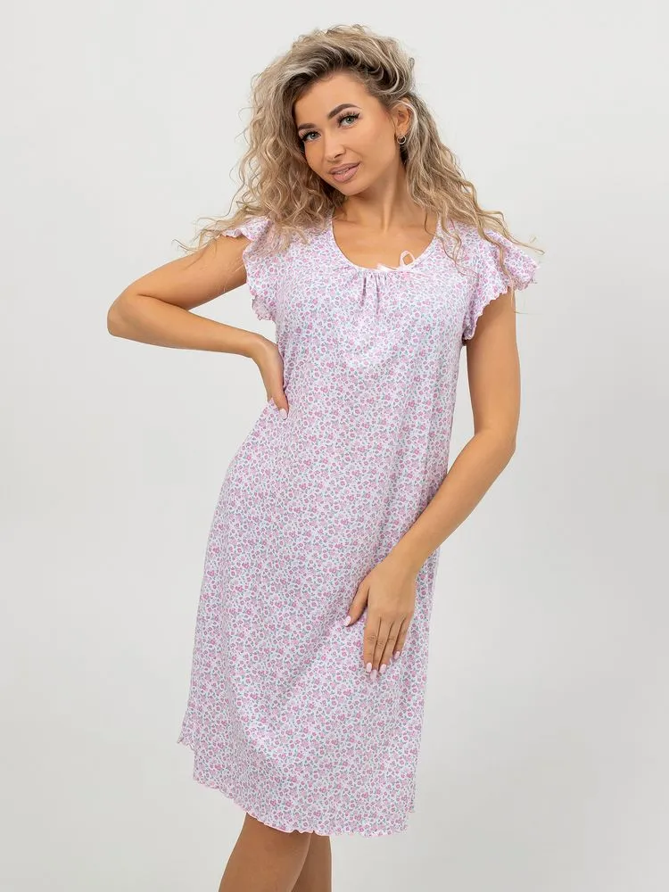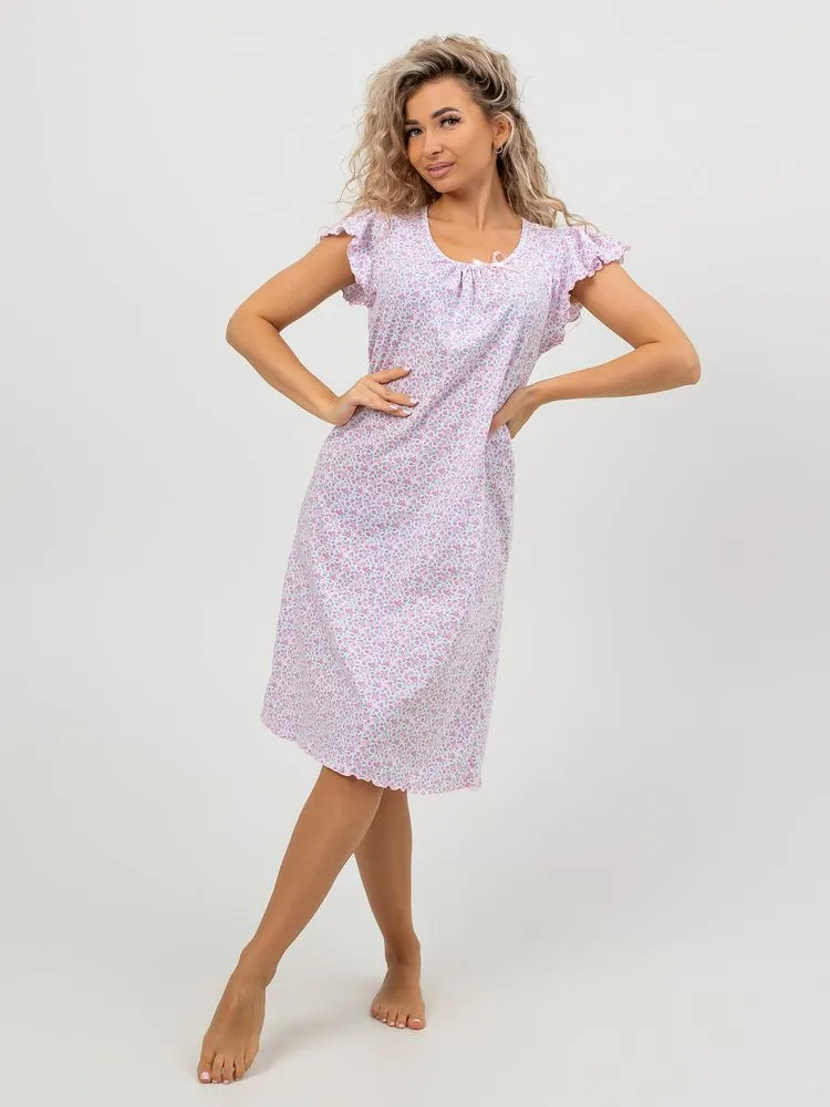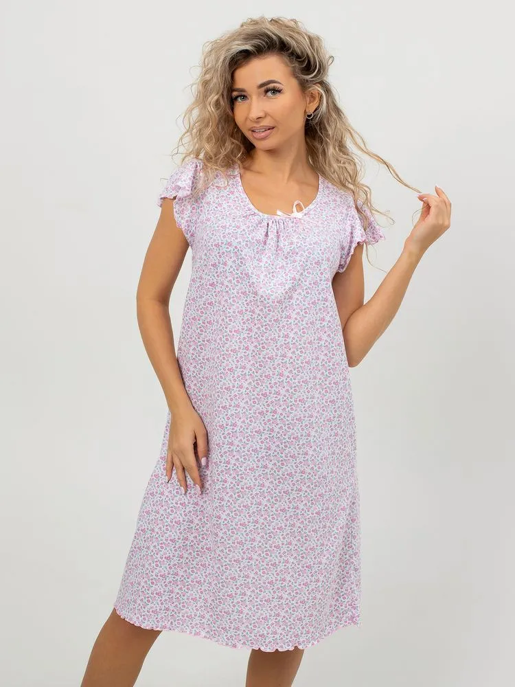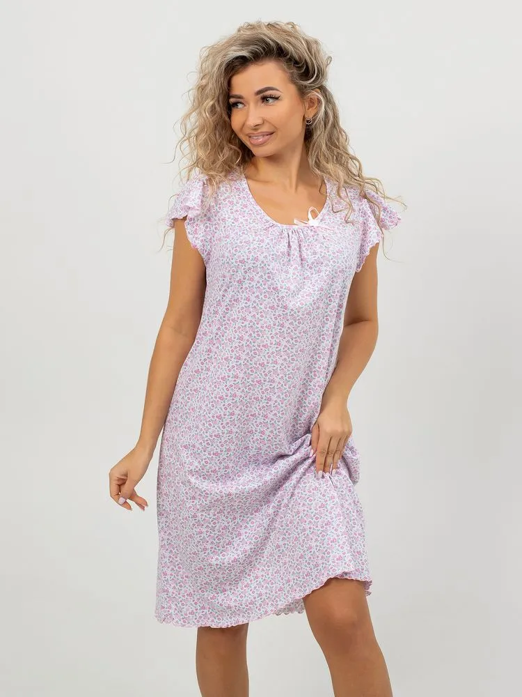 Перед Вами милая и нежная женская сорочка для комфортного сна. Лёгкая ночнушка свободного кроя прекрасно сидит на фигуре любого типа. Изготовлена из 100% натурального хлопка, ткань мягкая, дышащая и приятная к телу, прекрасно тянется.  В то же время ткань достаточно плотная, не просвечивает. Очень мило смотрятся нежные веточки лаванды, мелкие изящные цветочки, кружевные сердечки на светлом фоне. Рукав –крылышко со сборками дает полную свободу движений. Отделка рукава и низа изделия (обметочная строчка с вытяжкой ткани) смотрится легко, воздушно. Небольшое изящное украшение из атласной ленточки на овальном вырезе горловины завершает нежный образ. Длина изделия – чуть ниже колена. Рост сорочки универсальный. Силуэт сорочки расклешенный, она прекрасно подойдёт также будущим мамам. Размерный ряд 44-60.