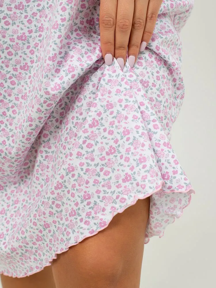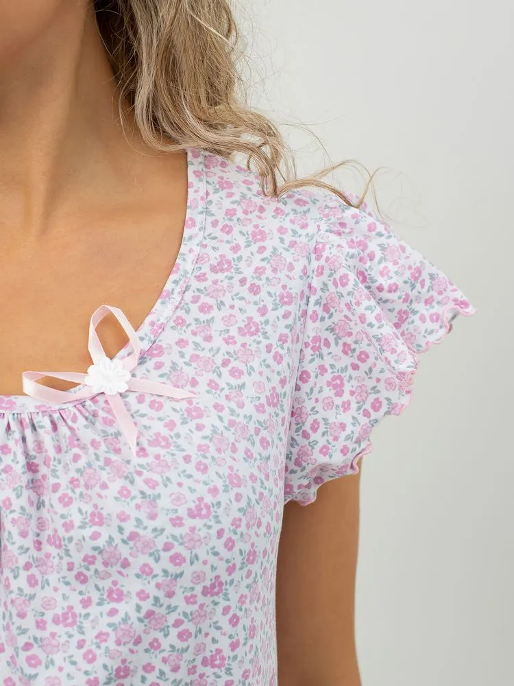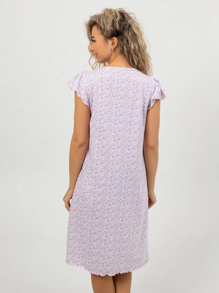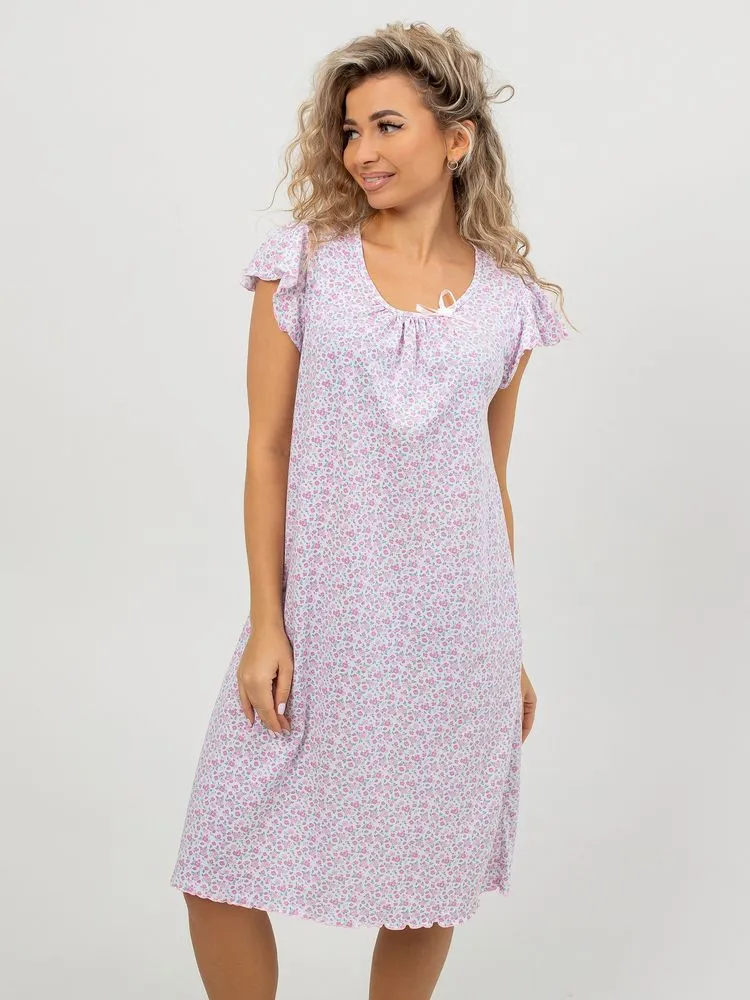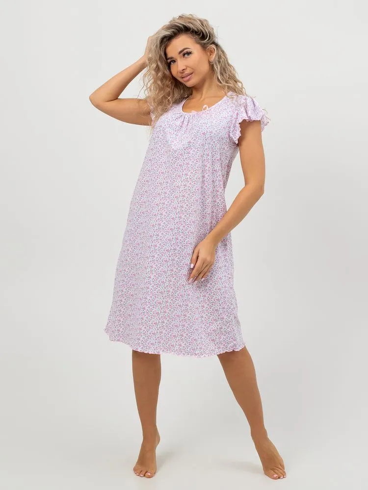 Перед Вами милая и нежная женская сорочка для комфортного сна. Лёгкая ночнушка свободного кроя прекрасно сидит на фигуре любого типа. Изготовлена из 100% натурального хлопка, ткань мягкая, дышащая и приятная к телу, прекрасно тянется.  В то же время ткань достаточно плотная, не просвечивает. Очень мило смотрятся нежные веточки лаванды, мелкие изящные цветочки, кружевные сердечки на светлом фоне. Рукав –крылышко со сборками дает полную свободу движений. Отделка рукава и низа изделия (обметочная строчка с вытяжкой ткани) смотрится легко, воздушно. Небольшое изящное украшение из атласной ленточки на овальном вырезе горловины завершает нежный образ. Длина изделия – чуть ниже колена. Рост сорочки универсальный. Силуэт сорочки расклешенный, она прекрасно подойдёт также будущим мамам. Размерный ряд 44-60.