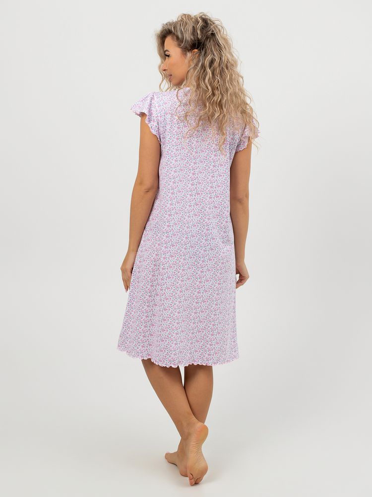 Перед Вами милая и нежная женская сорочка для комфортного сна. Лёгкая ночнушка свободного кроя прекрасно сидит на фигуре любого типа. Изготовлена из 100% натурального хлопка, ткань мягкая, дышащая и приятная к телу, прекрасно тянется.  В то же время ткань достаточно плотная, не просвечивает. Очень мило смотрятся нежные веточки лаванды, мелкие изящные цветочки, кружевные сердечки на светлом фоне. Рукав –крылышко со сборками дает полную свободу движений. Отделка рукава и низа изделия (обметочная строчка с вытяжкой ткани) смотрится легко, воздушно. Небольшое изящное украшение из атласной ленточки на овальном вырезе горловины завершает нежный образ. Длина изделия – чуть ниже колена. Рост сорочки универсальный. Силуэт сорочки расклешенный, она прекрасно подойдёт также будущим мамам. Размерный ряд 44-60.
