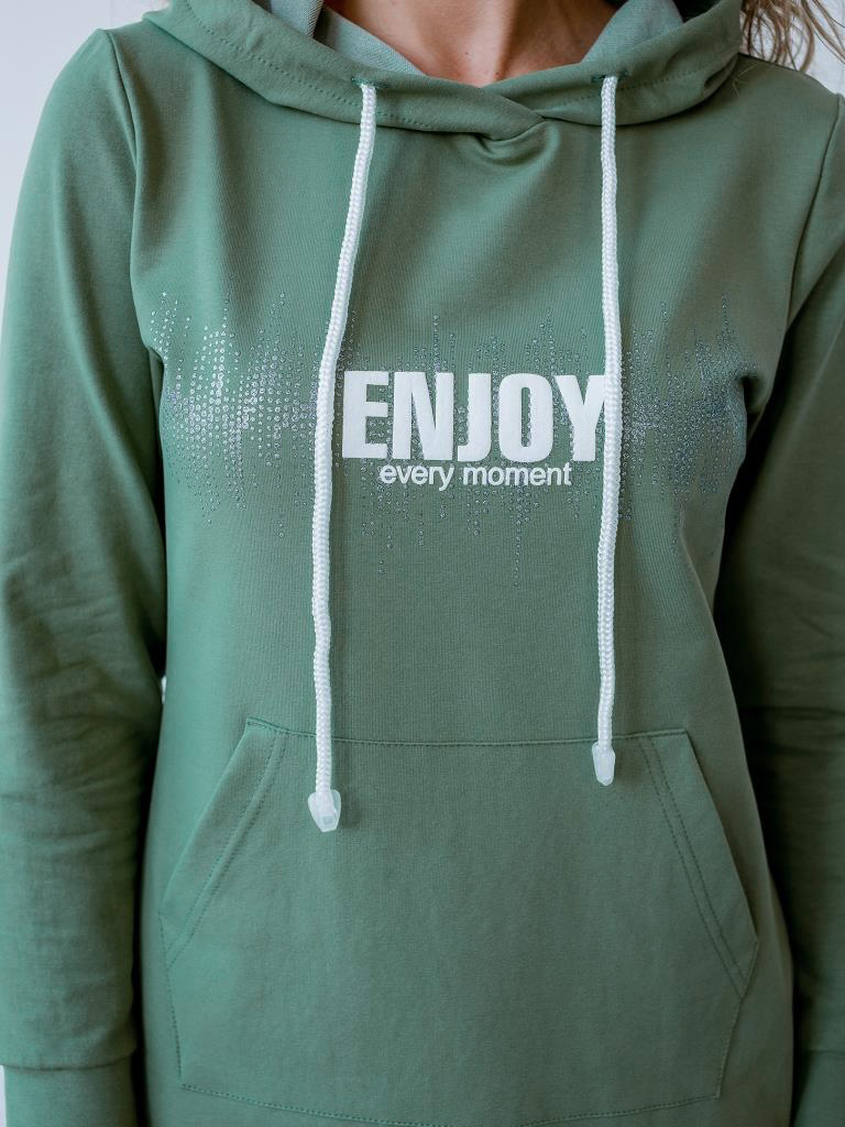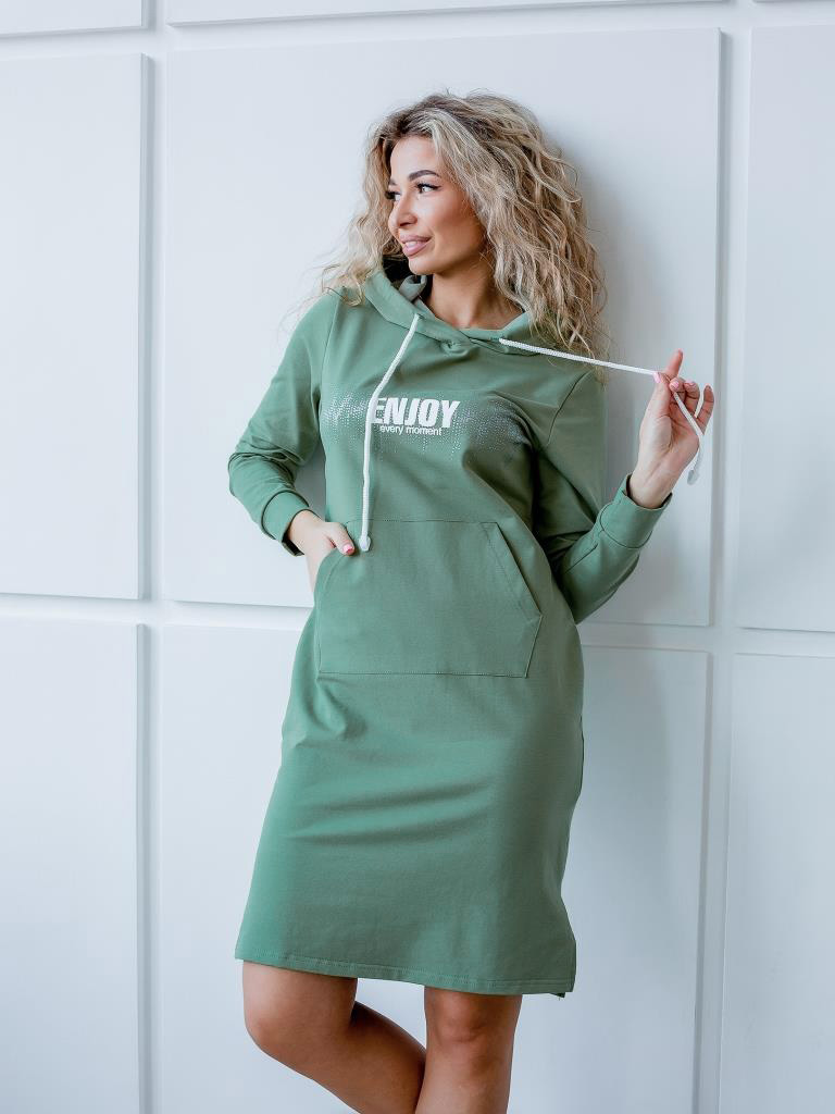 Туника женская утепленная с капюшоном, большим карманом «кенгуру» и красивым принтом со стразами. Рисунок очень качественный, выполнен с использованием современных технологий. Ткань – футер, двухнитка. Состав: хлопок 80 %, полиэстер 15%, лайкра 5%. Изделия из этой ткани очень просты в обслуживании, мало мнутся, долго сохраняют внешний вид.