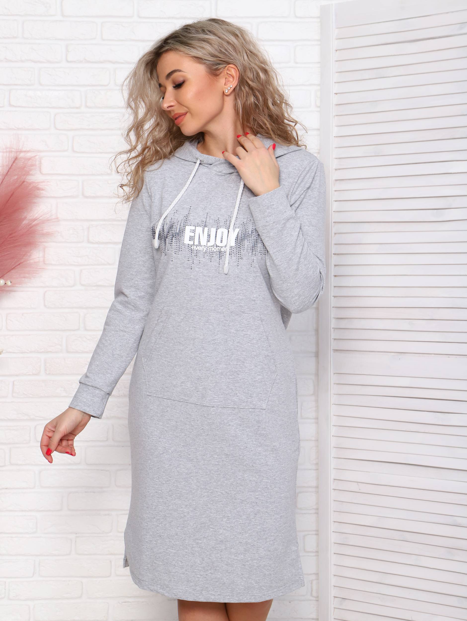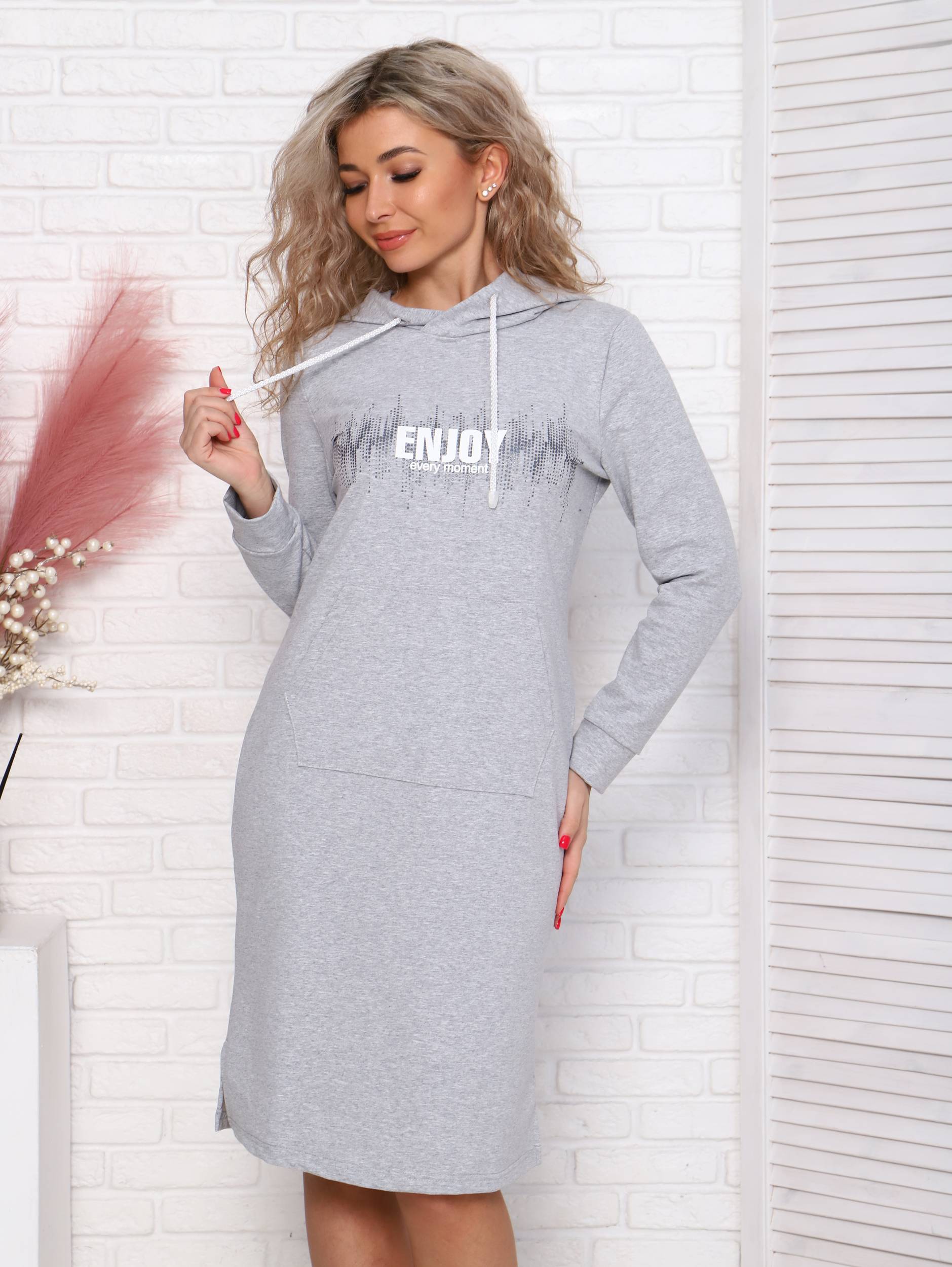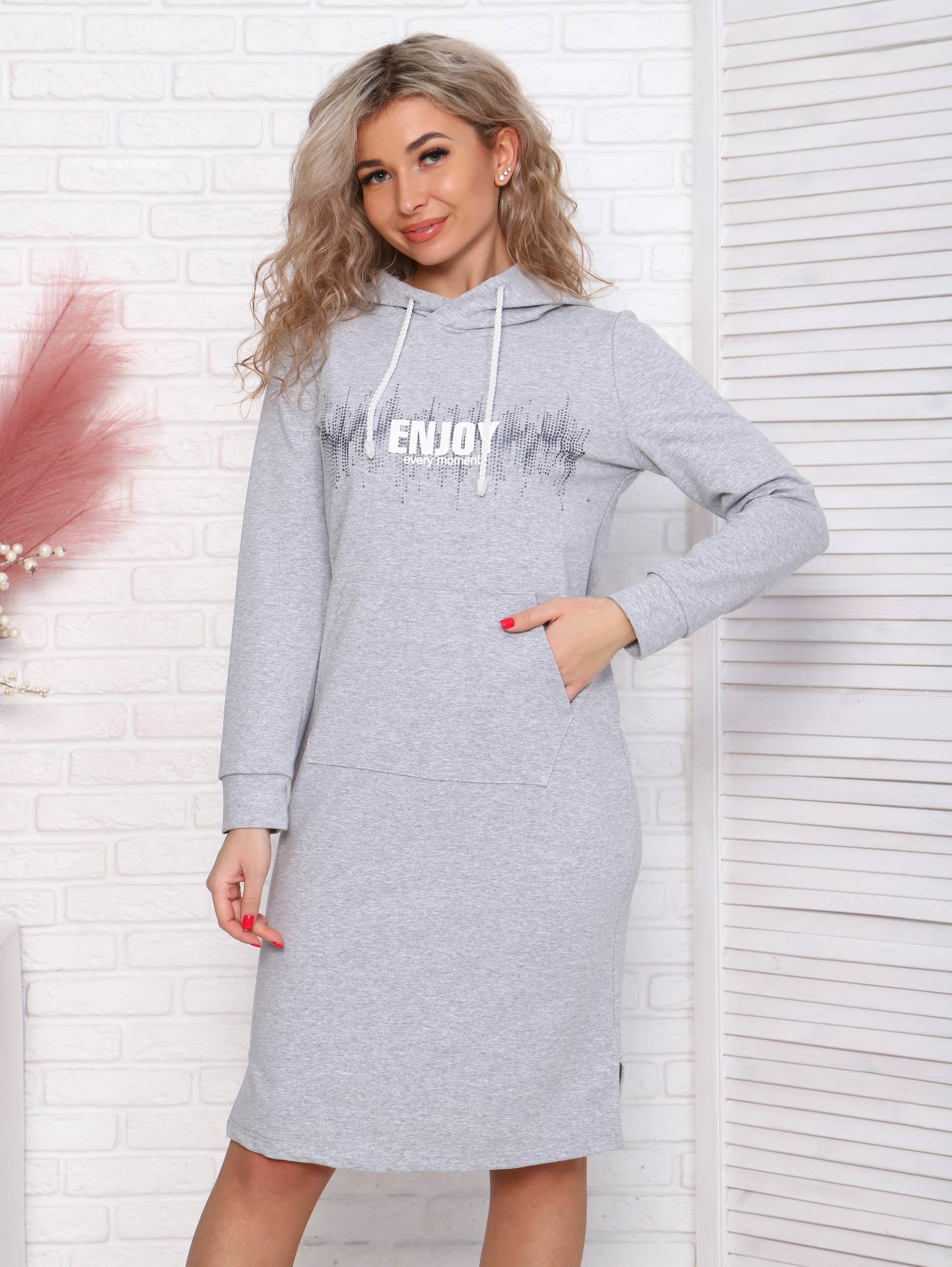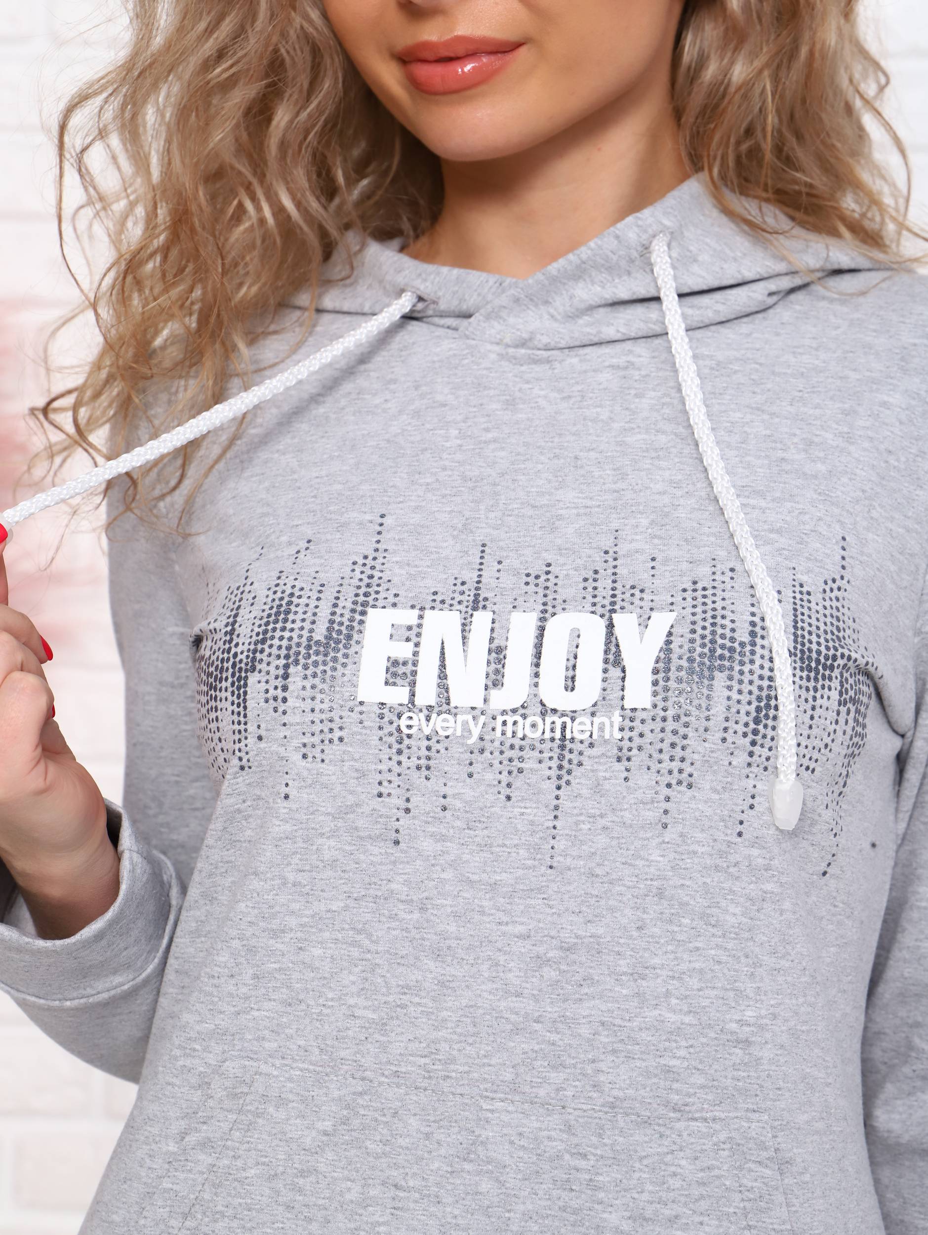 Туника женская утепленная с капюшоном, большим карманом «кенгуру» и красивым принтом со стразами. Рисунок очень качественный, выполнен с использованием современных технологий. Ткань – футер, двухнитка. Состав: хлопок 80 %, полиэстер 15%, лайкра 5%. Изделия из этой ткани очень просты в обслуживании, мало мнутся, долго сохраняют внешний вид.