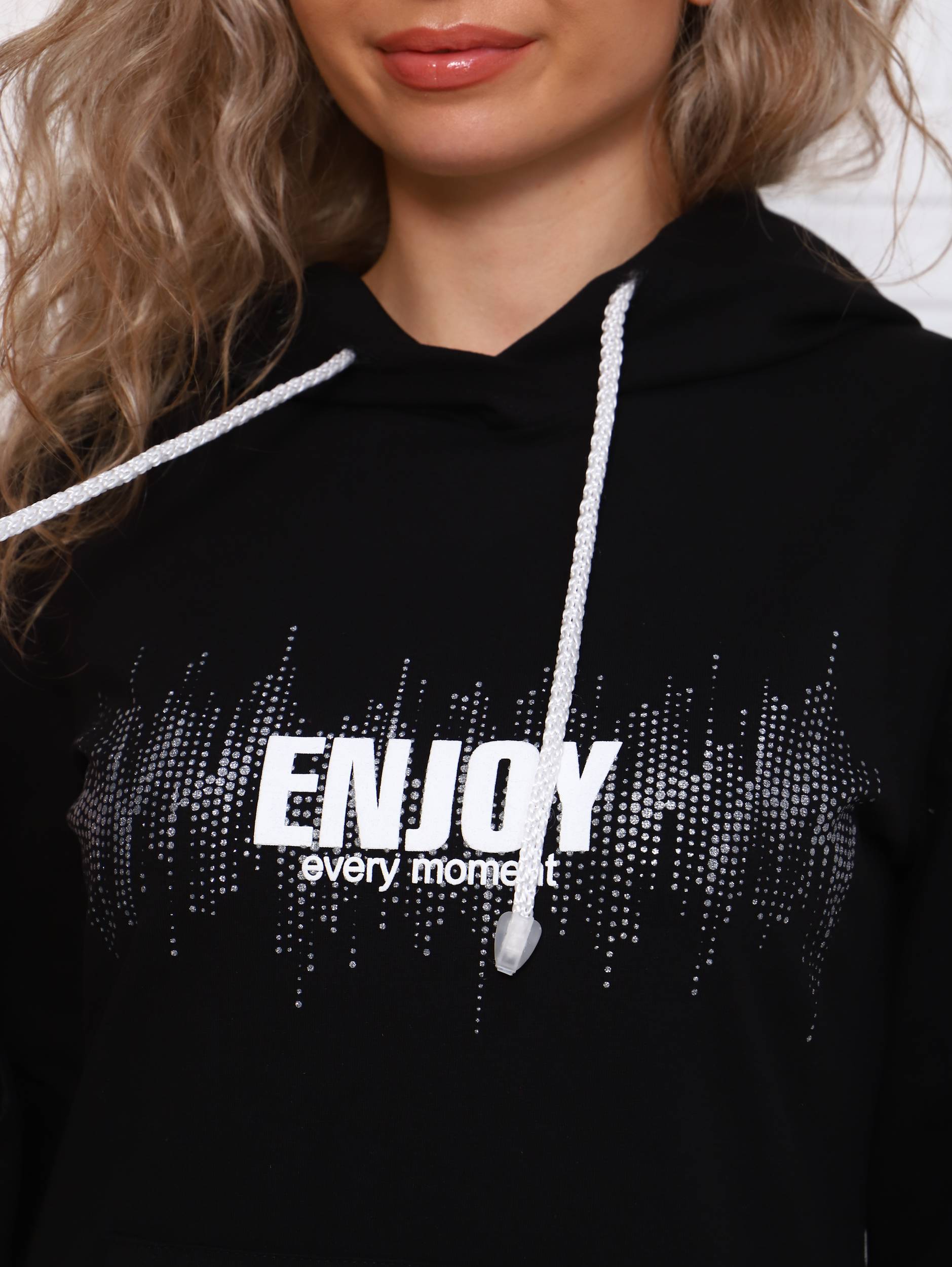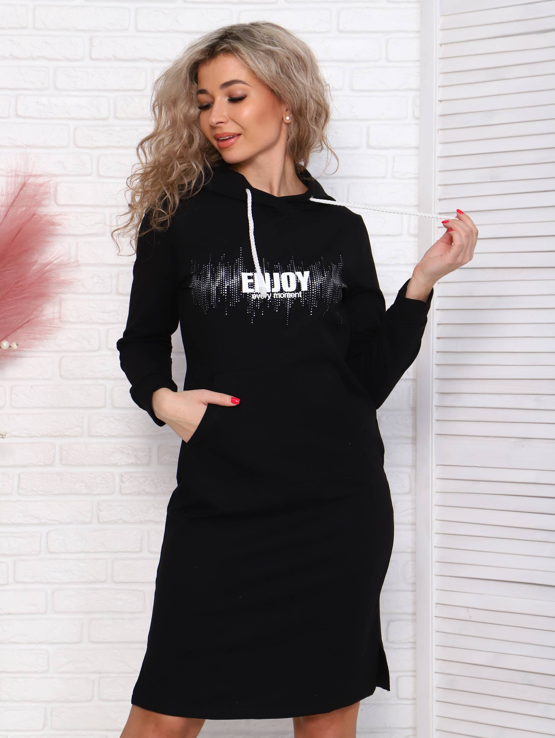 Туника женская утепленная с капюшоном, большим карманом «кенгуру» и красивым принтом со стразами. Рисунок очень качественный, выполнен с использованием современных технологий. Ткань – футер, двухнитка. Состав: хлопок 80 %, полиэстер 15%, лайкра 5%. Изделия из этой ткани очень просты в обслуживании, мало мнутся, долго сохраняют внешний вид.