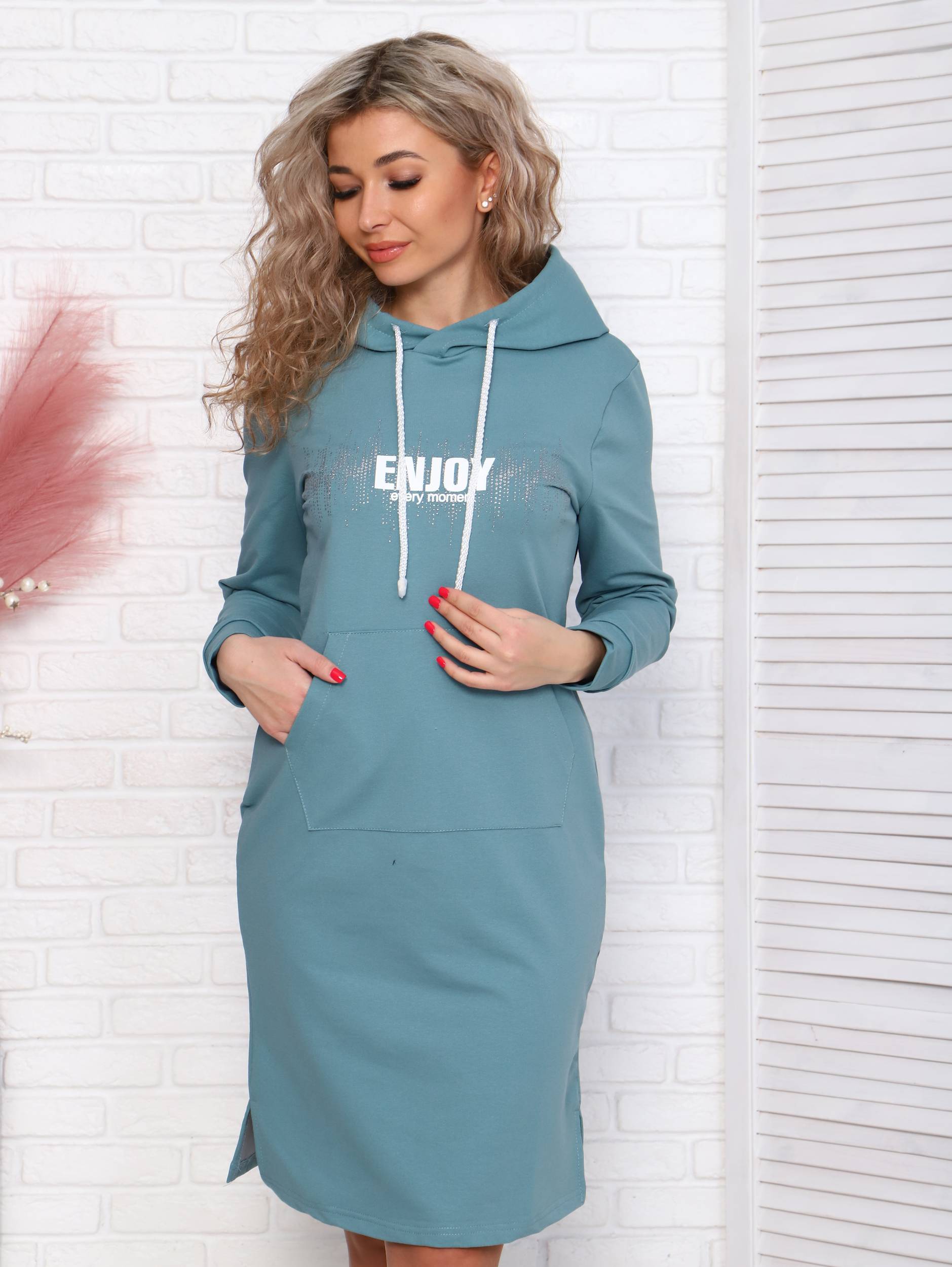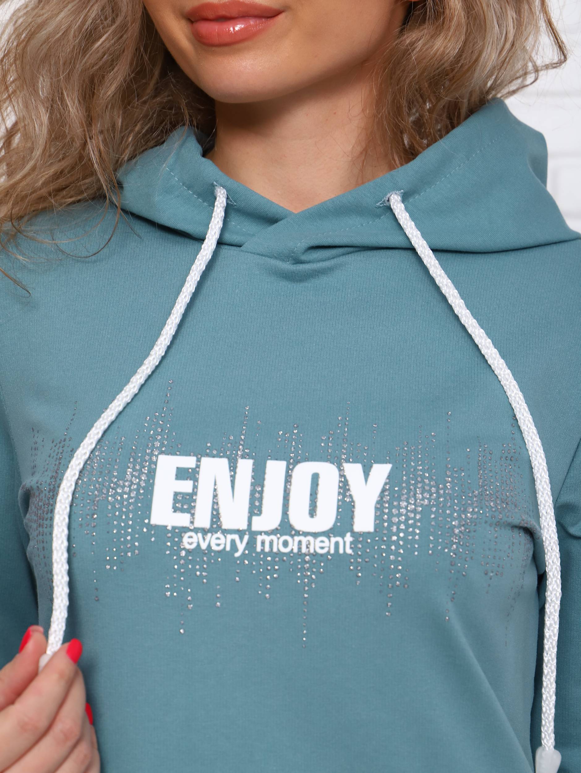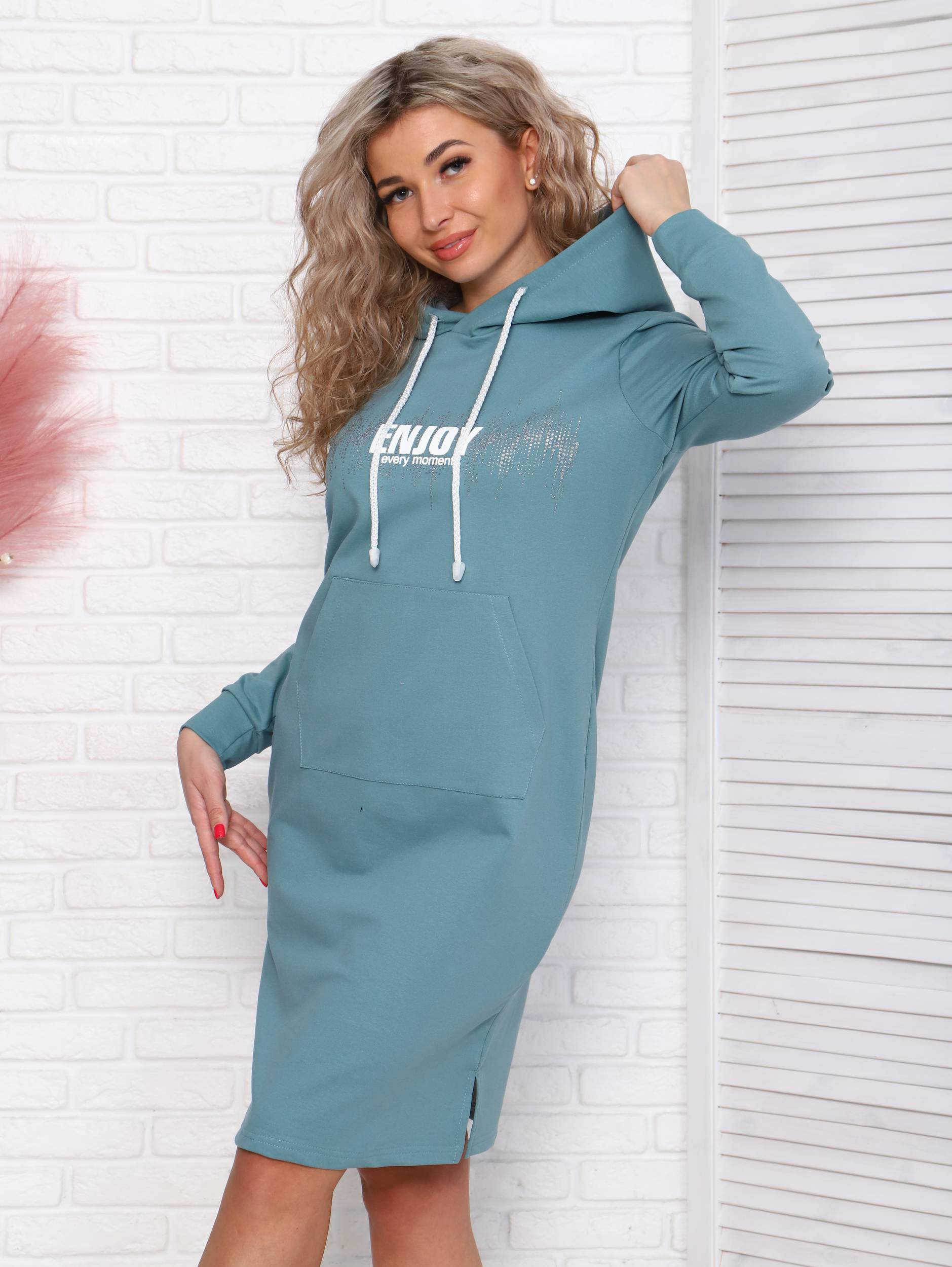 Туника женская утепленная с капюшоном, большим карманом «кенгуру» и красивым принтом со стразами. Рисунок очень качественный, выполнен с использованием современных технологий. Ткань – футер, двухнитка. Состав: хлопок 80 %, полиэстер 15%, лайкра 5%. Изделия из этой ткани очень просты в обслуживании, мало мнутся, долго сохраняют внешний вид.
